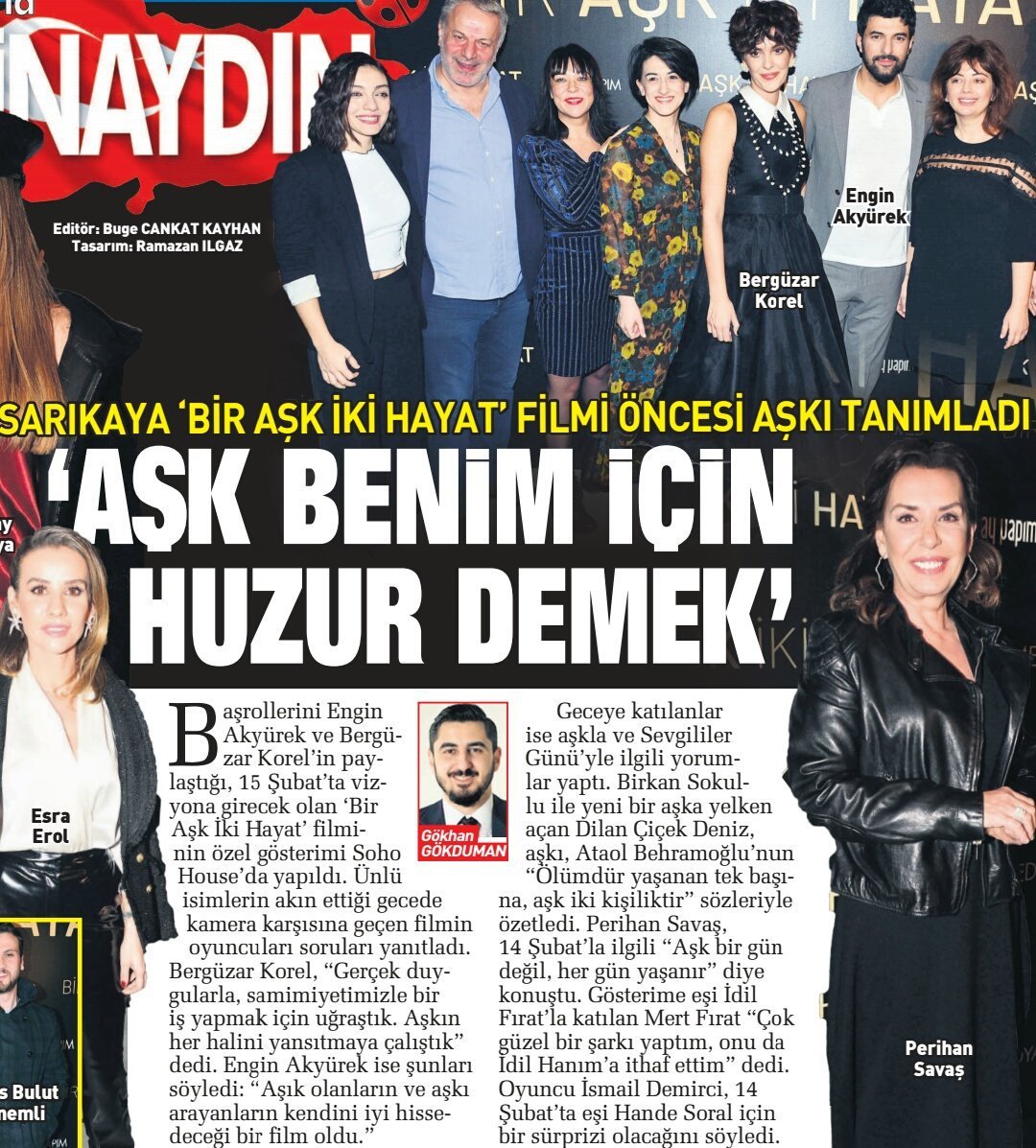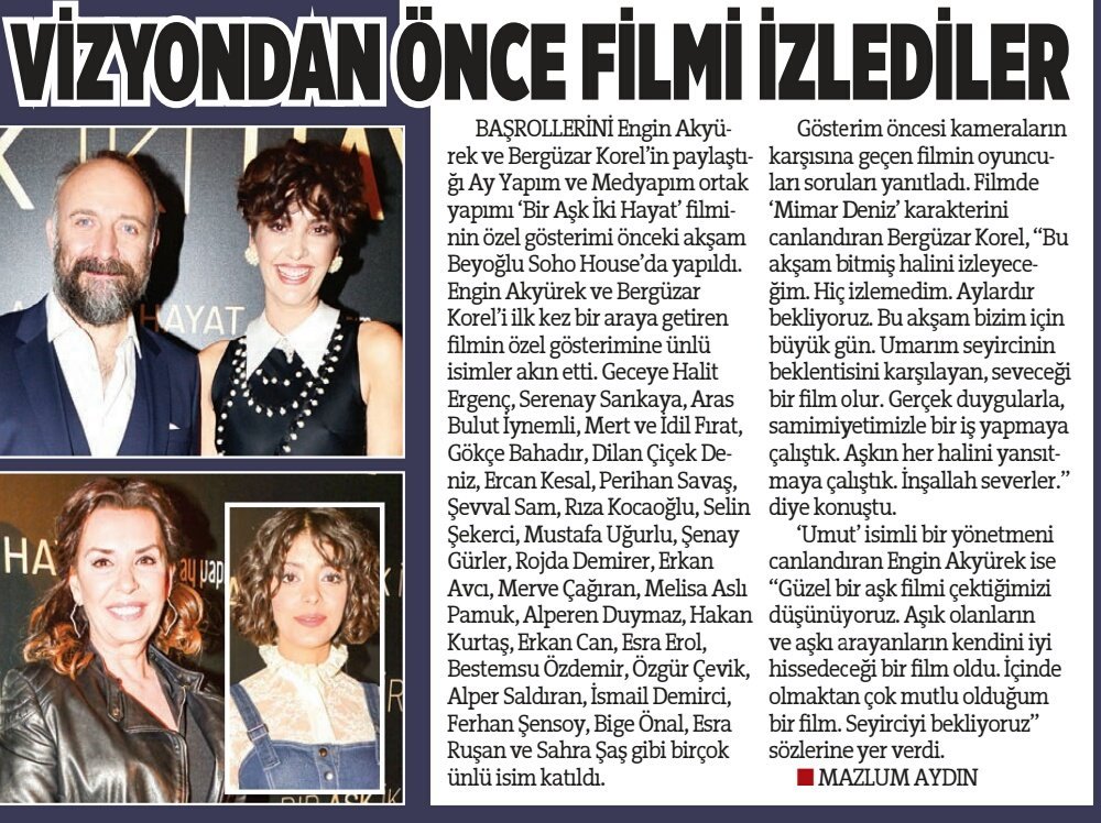 Следващият петък, 15 февруари, Бергюзар и Енгин ще присъстват в Измир за специалната прожекция на техния филм. Това ще се случи в големия киносалон "Измир оптимум" .... Главните герои ще се присъединят към феновете си ... това ще бъде уникален повод!