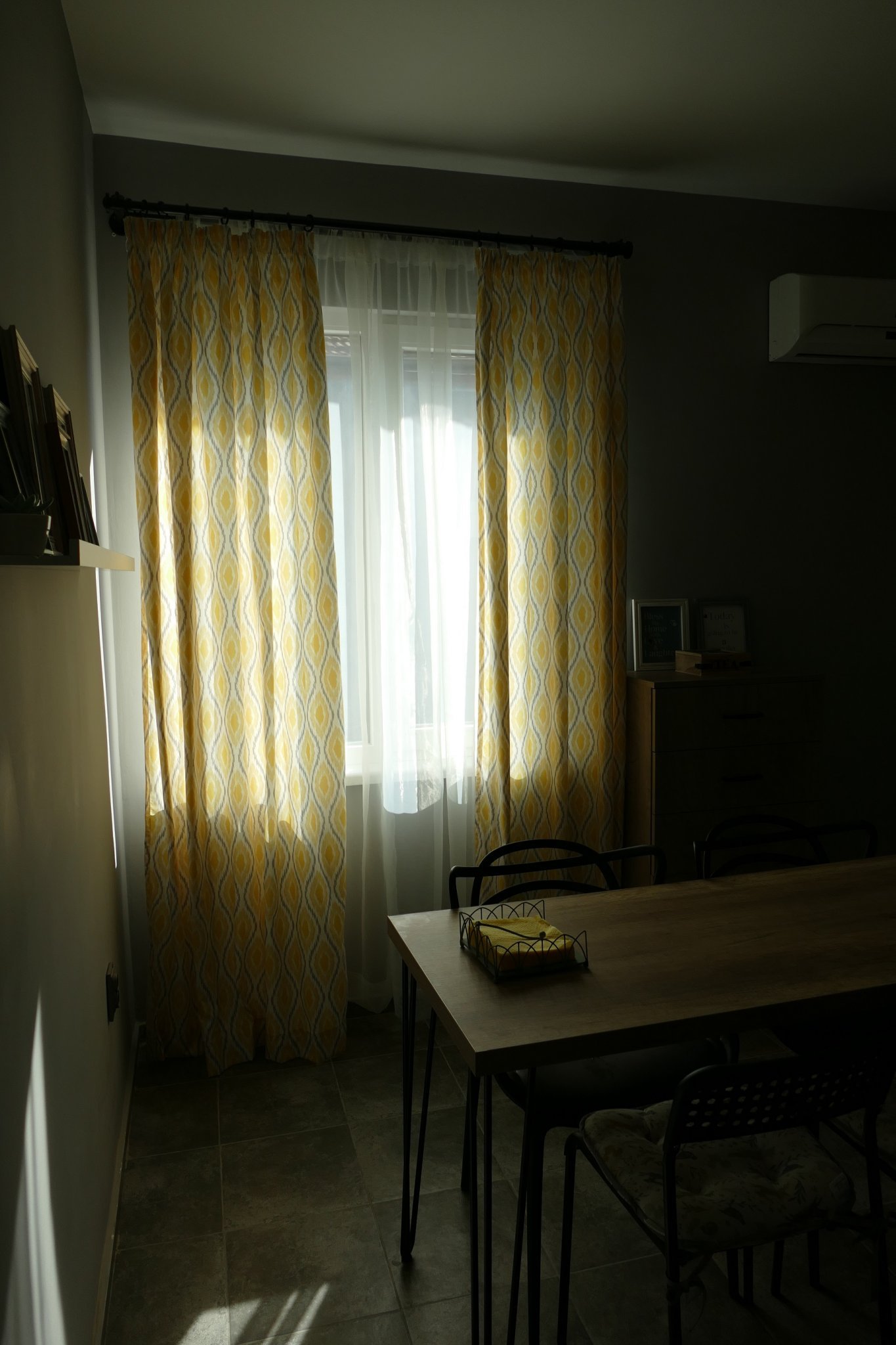 Аз бих сменила пердета на едноцветни. За да не се измества акцента от гърба на кухнята.