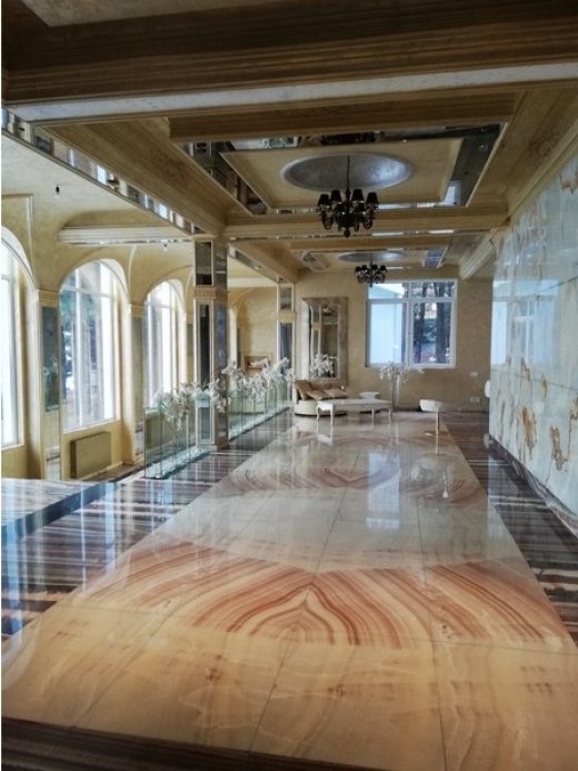 Toва по пода не е гранитогрес, а истински камък, всички плочи рязани от един блок и номерирани за да се редят после по реда на рязането. Така се получава това напасване на шарките. Това е най-скъпарското и луксозно покритие с плочи. Не, че поради това къщата им не е кичозна, но това вече е друг въпрос Mr. Green