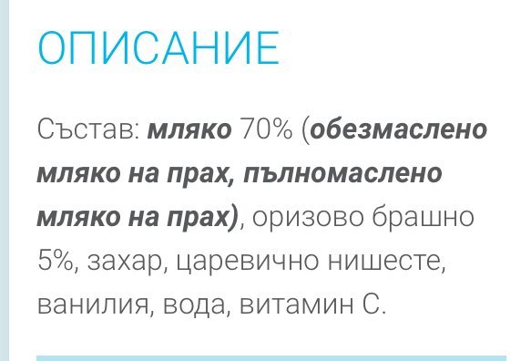 Нандин, знам че има в повечето да не кажа във всички захар и сухо мляко.  Но ето днес дадох на Ганчев - мляко с ориз за сз и четох не пишеше захар. И поне не е директно прясно мляко. Решила съм поне докато навърши 1г да не давам пр.мляко. и с белтъка още се мотам.