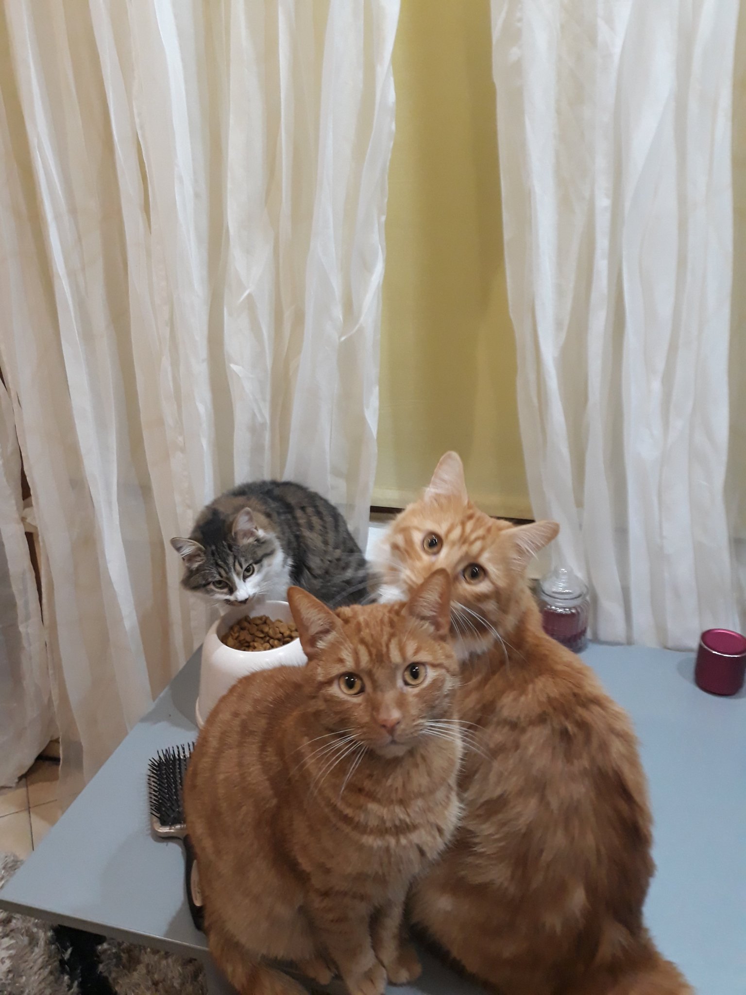 Аз имах три, пенсионера, реших да си взема коте, че да не остана сама, като си иде, та две, послевзех сестричка на Сиси, да има с кой да си играе, като си отиде пенсионера, та три. И насред пенсионери и диви тинейджърски котки взех, че си взех и едричко куче. Та четири.