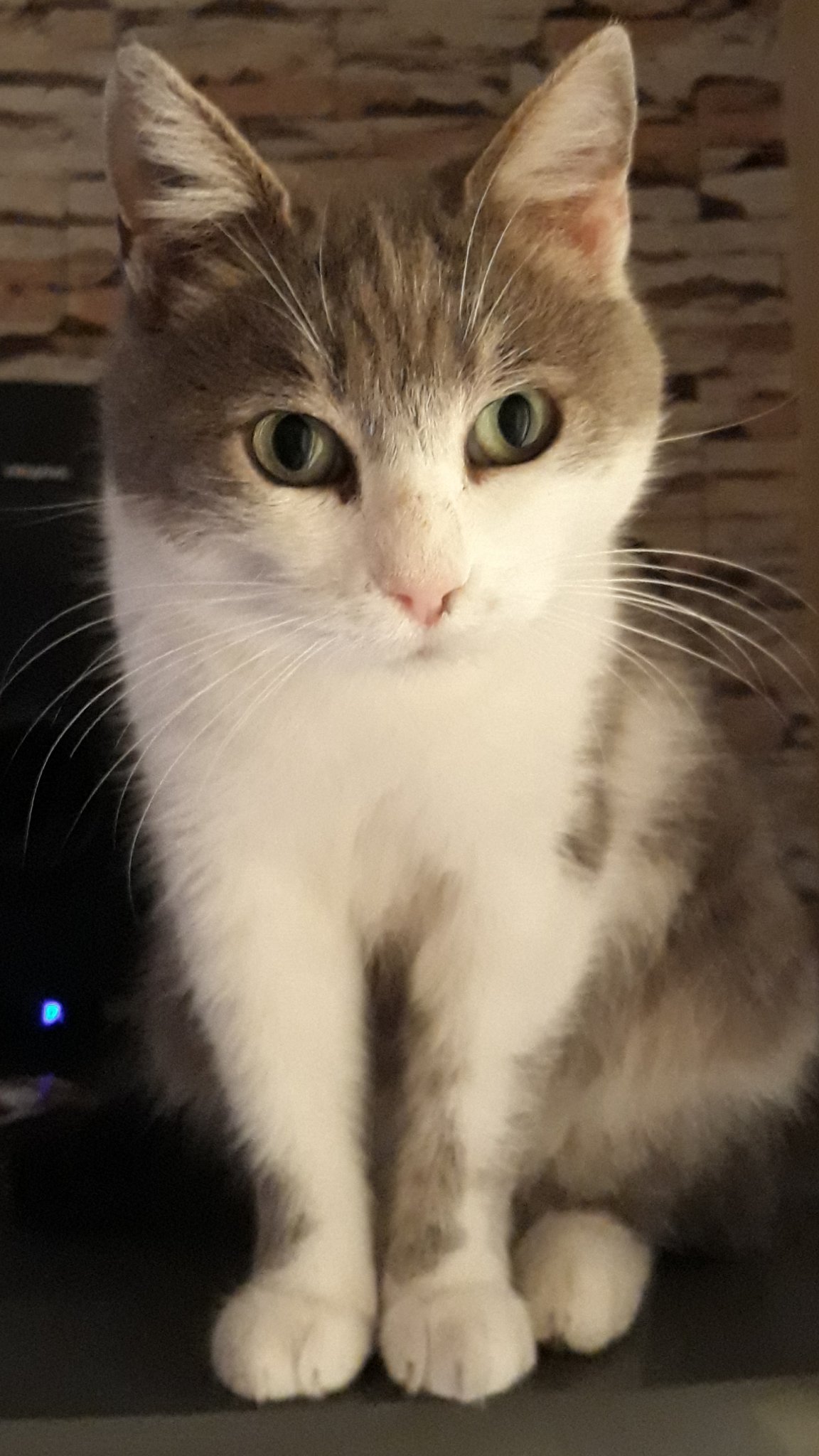 Това е Мая. От приют е взета. Мисли си, че е куче. Ходи с нас с кучето на разходка и бие другите кучета навън или им влиза по дворовете. Кастрирана е. На около 3 години.