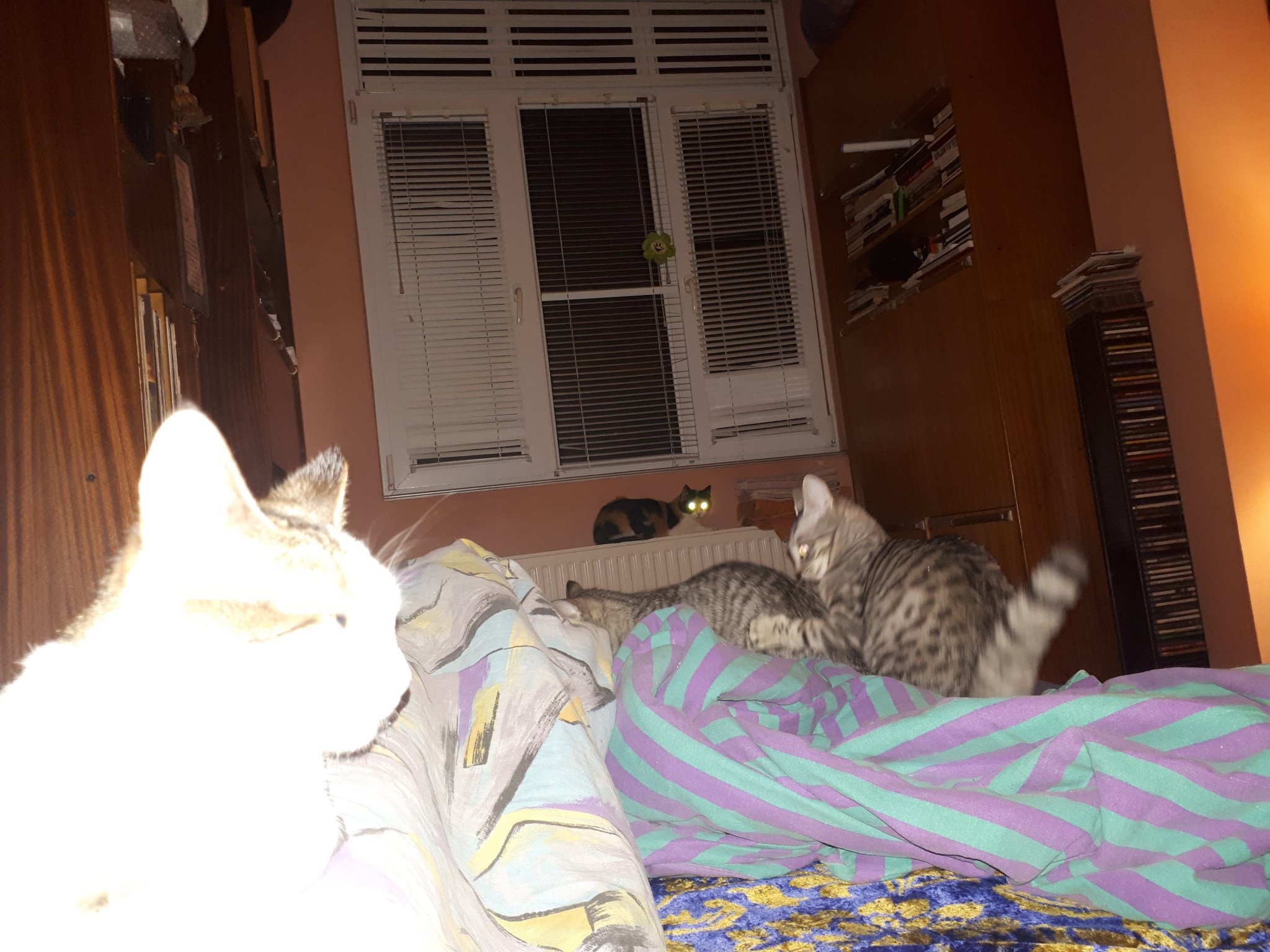 Снимката е с кофти качество, но заради вас я правих и затова качвам. Преди 10 мин се прибрах от работа и полегнах. Веднага целият прайд се настани наоколо 😂 Мъра обичайно е върху радиатора на топло😏 Беки винаги е върху мен, а Уискасите си се бият помежду си. Докато пиша това всичко живо изпозаспа 🤣🤗🤩