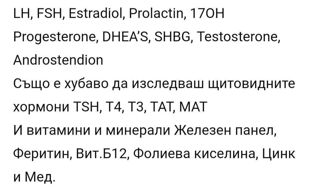 Надбъбречни хормони, полови, щитовидни и основни витамини- б12, вит Д, фолиева също. Може да забравям нещо, но горе долу са това.   Цената зависи от лаборсторията, но около 250лв