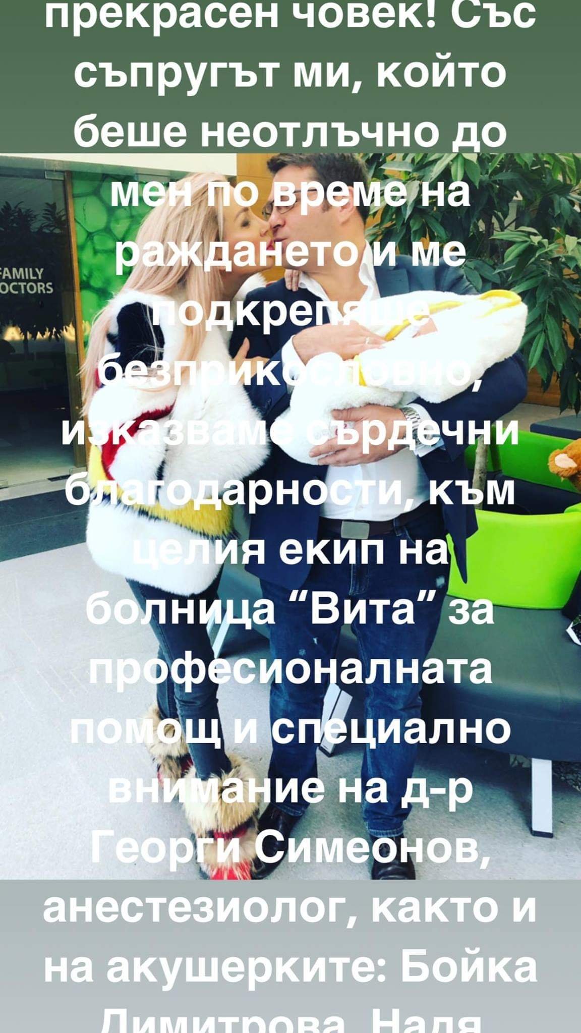 ''Семейство Батинкови ще станем трима! Със съпруга ми Ивайло Батинков очакваме първото си дете! И двамата ще станем родители за първи път и то на най-мечтания син! По този най-вълнуващ и съкровен за нас повод, създадохме тези красиви кадри, които истински пресъздават и заразяват с огромното ни семейно щастие и любов и които искаме да споделим с целия свят! Нямаме търпения да станем родители, ние сме най-щастливата и влюбена двойка! А Първородният ни син е най-желаното и обичано бебе на света!''