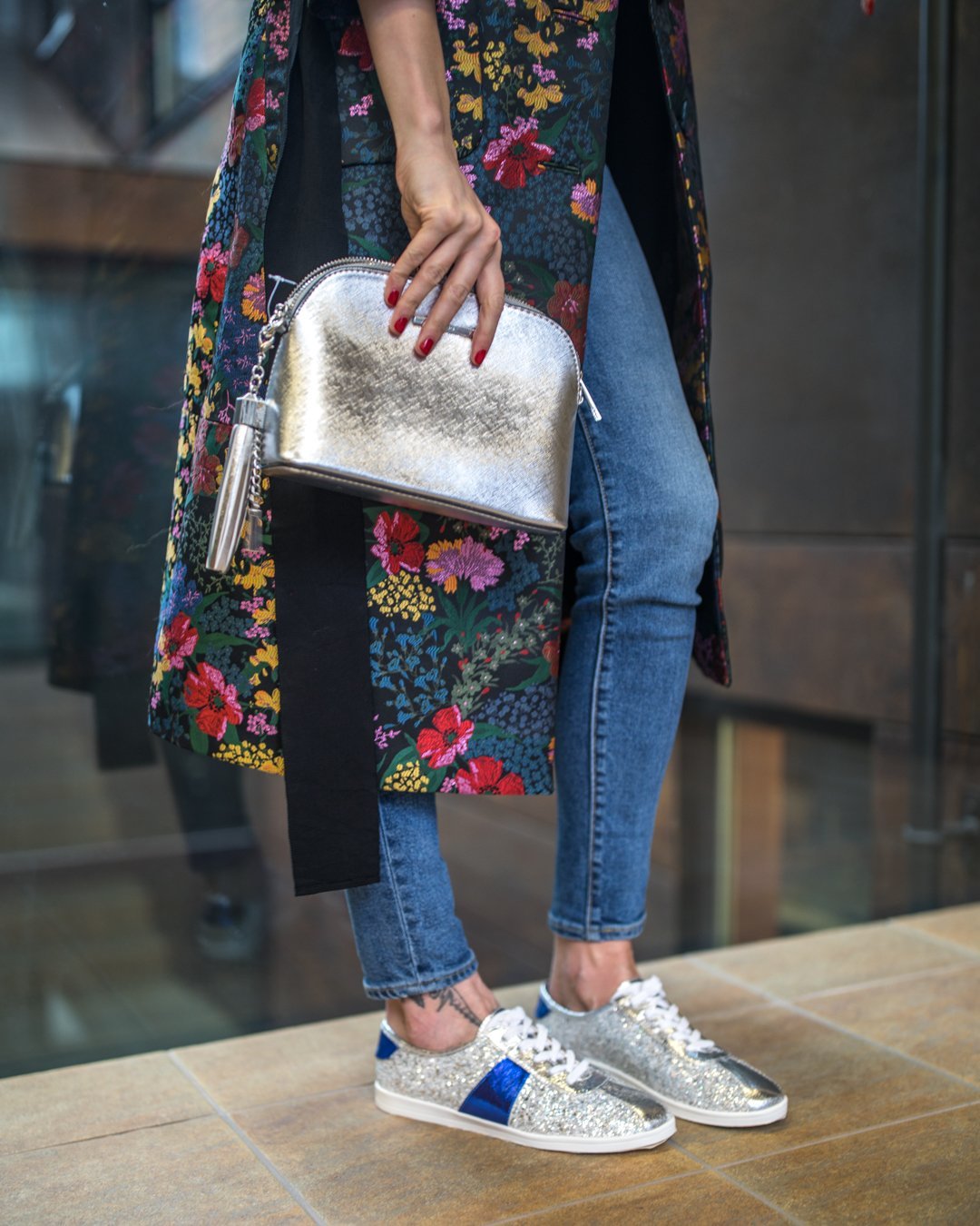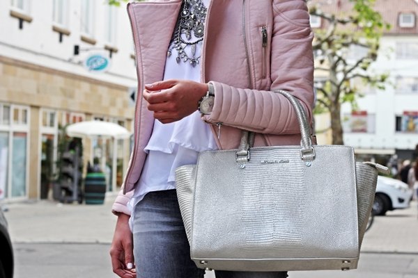 Сребристата чанта отива със всичко - черно, дънково, синьо, червено, розово, нюд. Само да не е сиво или сребристо, за да не се сливат.