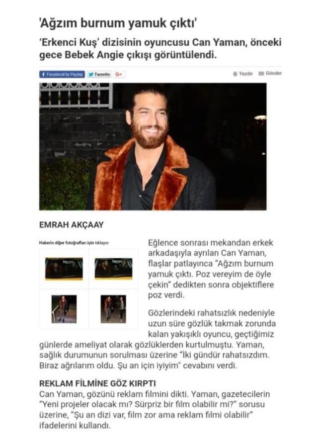 ▪ Джан Яман был замечен прошлым вечером в районе Бебек. Как известно, актёр недавно перенес небольшую операцию на глаза. Журналисты поинтересовались здоровьем Джана.