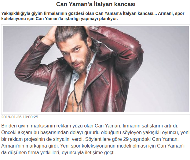 ❥Всемирно знаменитый бренд Armani планирует подписать договор с Джаном Яман для своей новой спортивной коллекции. Представители бренда связались с ним заранее разузнав, что Джан сам владеет итальянским языком и у него в Италии не мало болельщиков. Если же актер подпишет договор с этим брендом, то получит всемирную популярность.