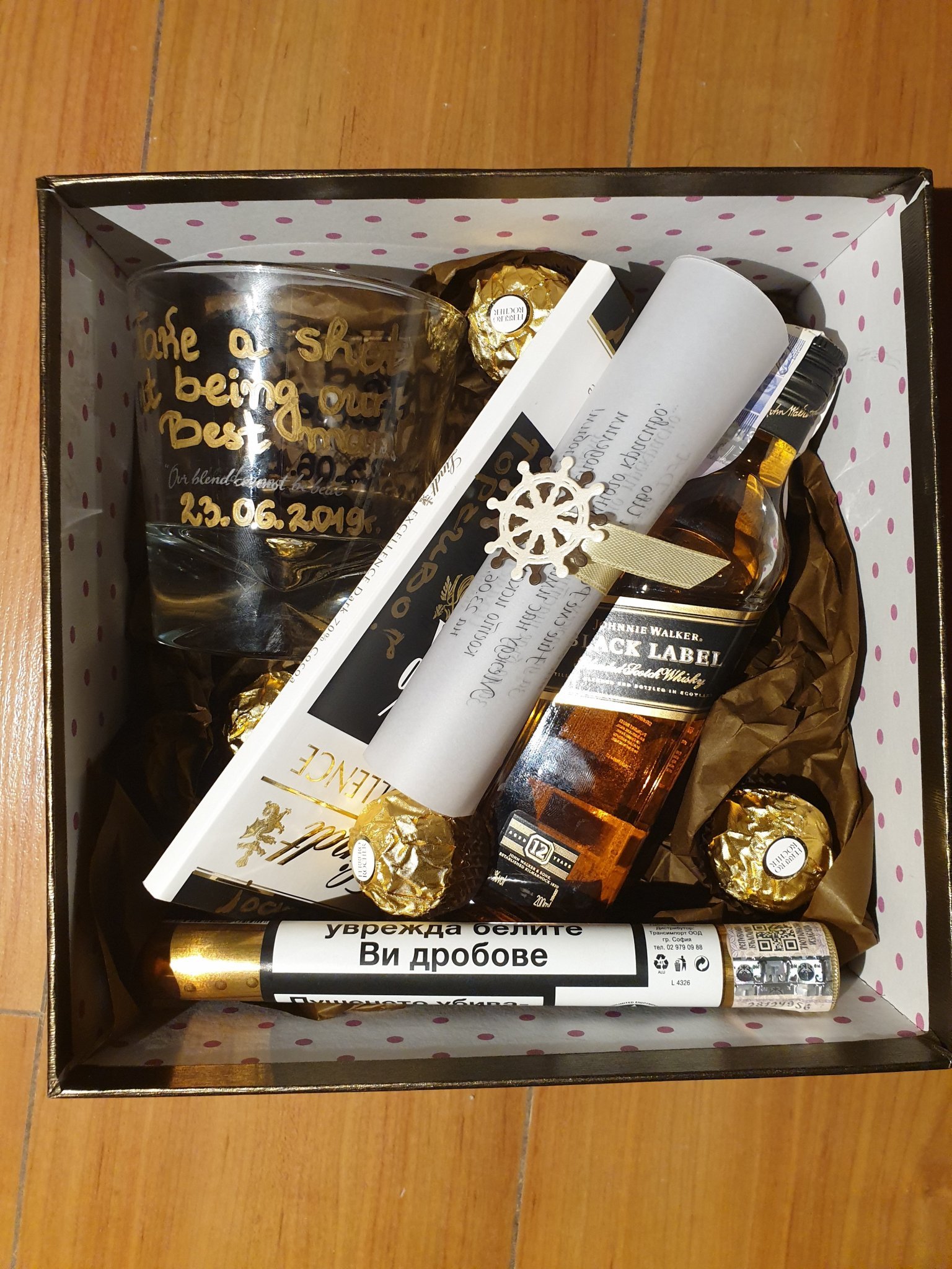 Най-трудно намерих кутията, но това е, защото търсих по сувенирните магазини, където няма богат избор и цените са доста по-високи. Накрая ходих в два големи китайски магазина и имаше огромен избор и в двата. За по-големите градове и Джъмбо е опция. Понеже държах да се придържам към кафяво-златната гама на кутията, включих в нея малка бутилка уиски, чаша за уиски, която надписах ръчно със златен перманентен маркер, златиста пура, черен шоколад, на който пише "горчиво" със златни букви (Grinning) и бонбони Фереро Роше. Сложих всичко върху кафява тишу хартия. Поръчах свитък със съчинена от мен покана под формата на стих и, мисля, се получи много добре.
