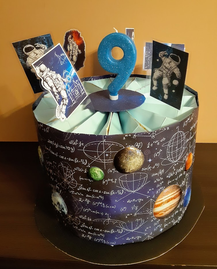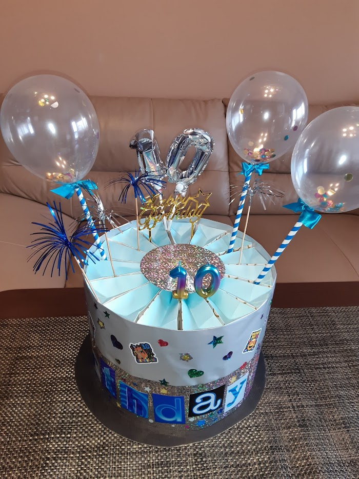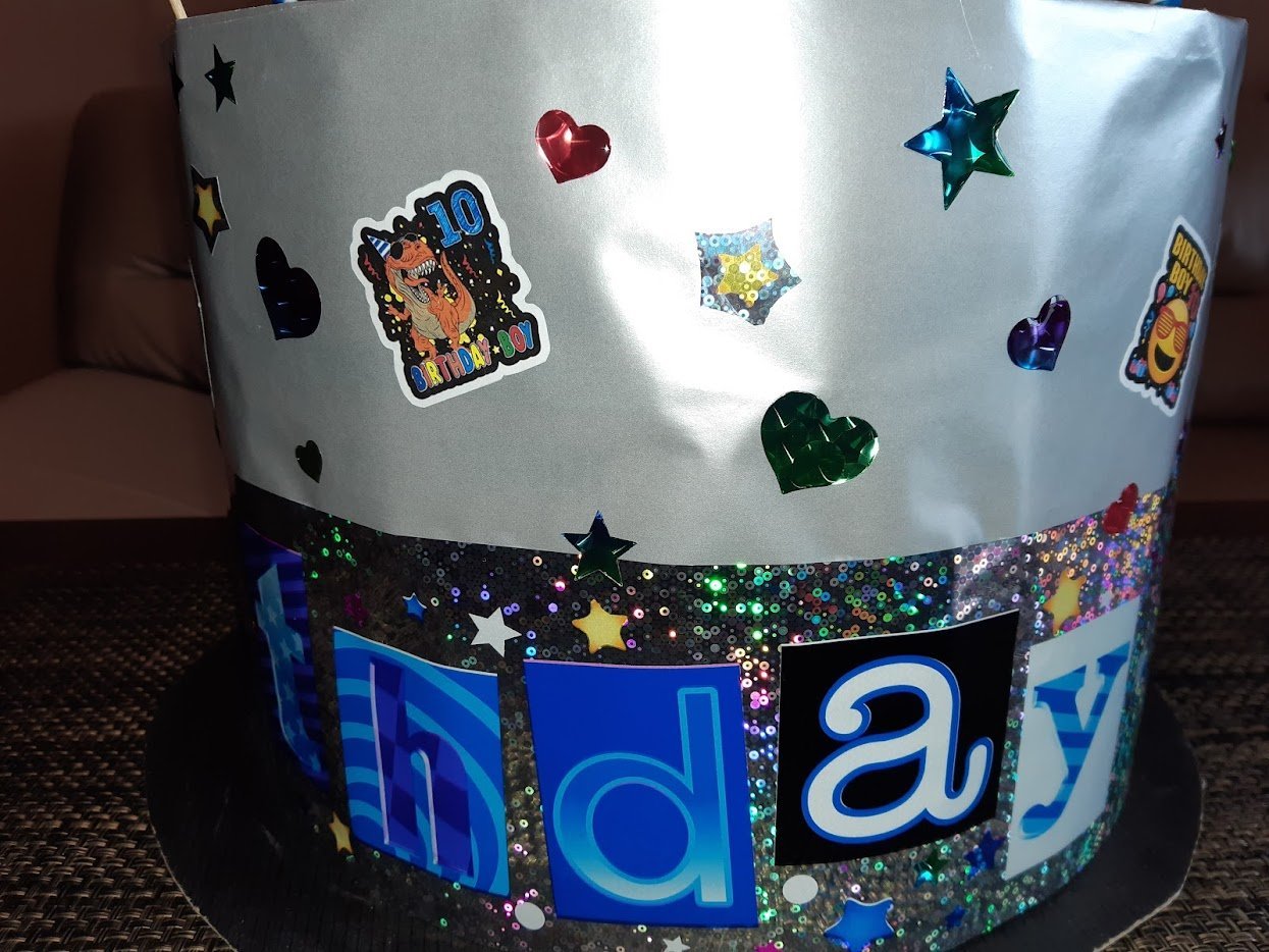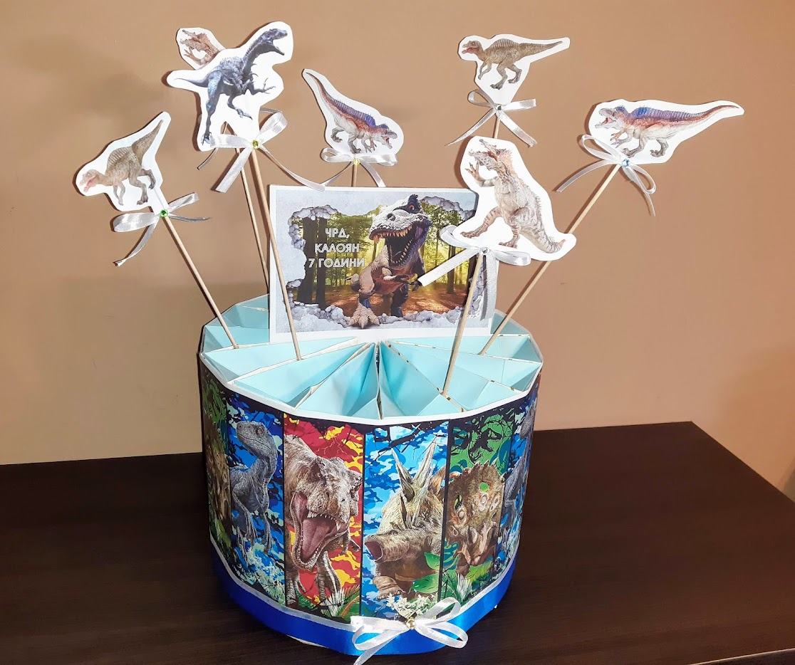 Хоп, и аз тук. Миналата година сглобявах картонена торта, която бях поръчала от интернет. Вътре напълних с балони и свирки. В нашата градина е забранено да се черпи с храна, не може дори бонбон.