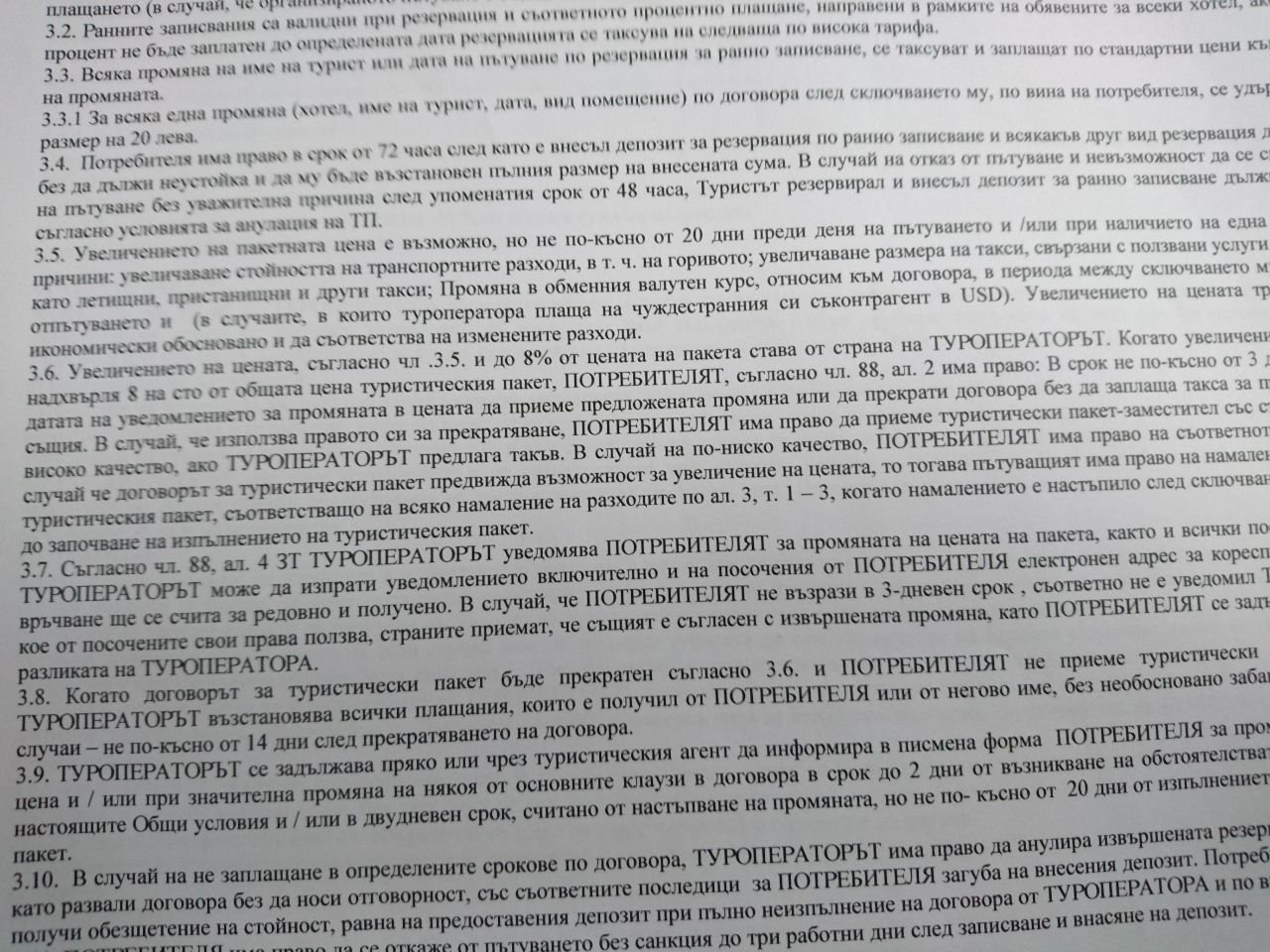 Eni27, ако се съмняваш в коректността на общите условия, цитирай точно текста, за да можем да преценим дали отговаря на изискванията на Закона за туризма. Когато клаузите са преразказани, винаги е възможно да се скъса някъде нишката.