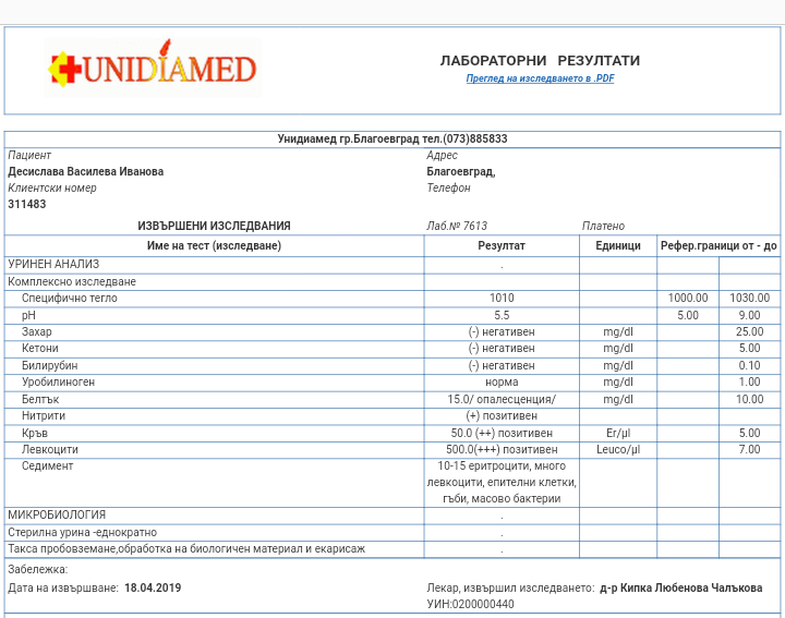 Дорсче, отложих ходенето за другата седмица, тъй като в петък мисля, че докторът може да е отишъл по разни конференции, а искам да е там, за да говоря с него. Оня ден си пуснах стерилна урина, тъй като имах проблем с пропишкването след свалянето на катетъра в болницата, а много ме е страх да не си прецакам бъбреците тъй като нали без това се оказа, на ямр-а, че десният по рождение не е ОК. Та направо съм втрещена от резултатите и записах час за уролог в понеделник. Качвам ги, ако някой може да изкаже мнение....
