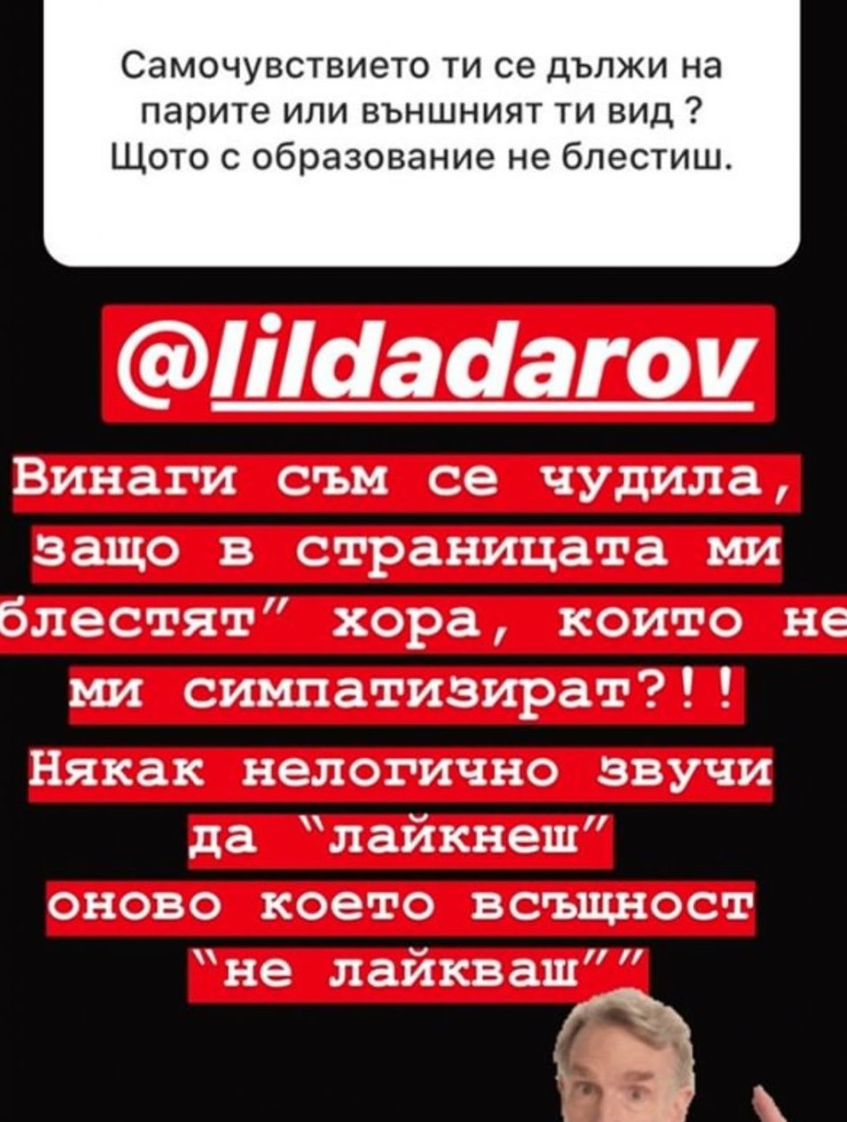 Аз не мисля, че има общо със злоба. И другите не бих ги сложила в графа зли. Просто тя изобщо не се интересува от мнение, а те четат и видят ли такова негативно веднага заклеймяват с първосигнални отговори, не мисля че дотолкова осъзнати да злобеят отявлено.
