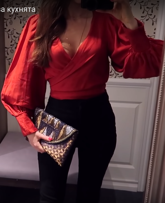 Червено + дълбоко деколте + прозрачна материя + тотално описващ панталон + някаква верижка в пазвата мярнах.