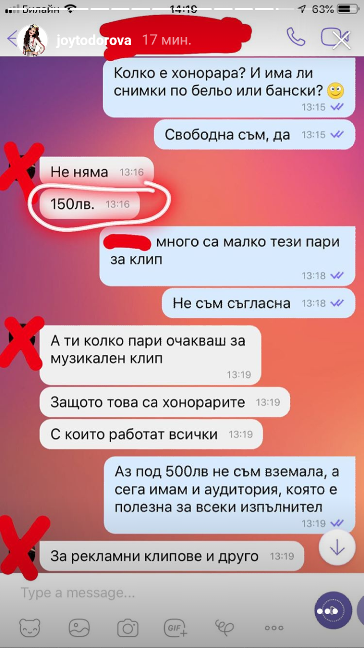 Тази Радост Тодорова постнали снимки как ѝ предлагат 150 лева за участие във видео на известен певец, тя искала 500 и се възмущава на стори. Тук коментираха, че можело да ѝ пише Мегз, което е абсурдно според мен, тя не се занимава с видеа, камоли на някой известен.