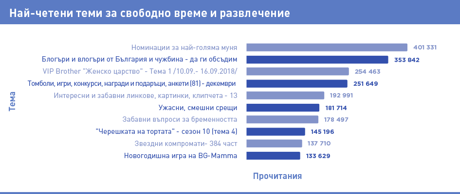 Най-четената тема в тази категория е “Номинации за най-голяма муня” - тема за смешни реални случки и забавни истории. Следват я в класацията “Блогъри и влогъри от България и чужбина - да ги обсъдим”, „Звездни компромати“, „Томболи, игри, конкурси, награди и подаръци, анкети” и няколко теми за дискутиране на нашумели предавания в родния ефир - „Черешката на тортата“, „Евровизия“ и „VIP Brother”, както и темата за сериала „Откраднат живот“.