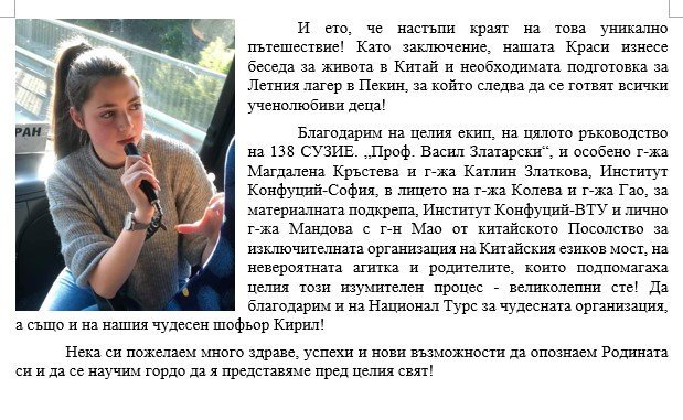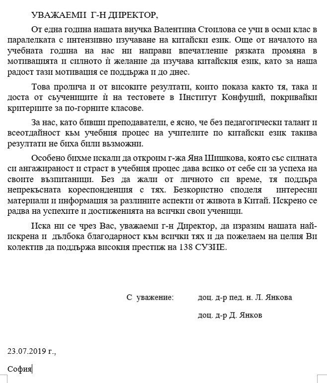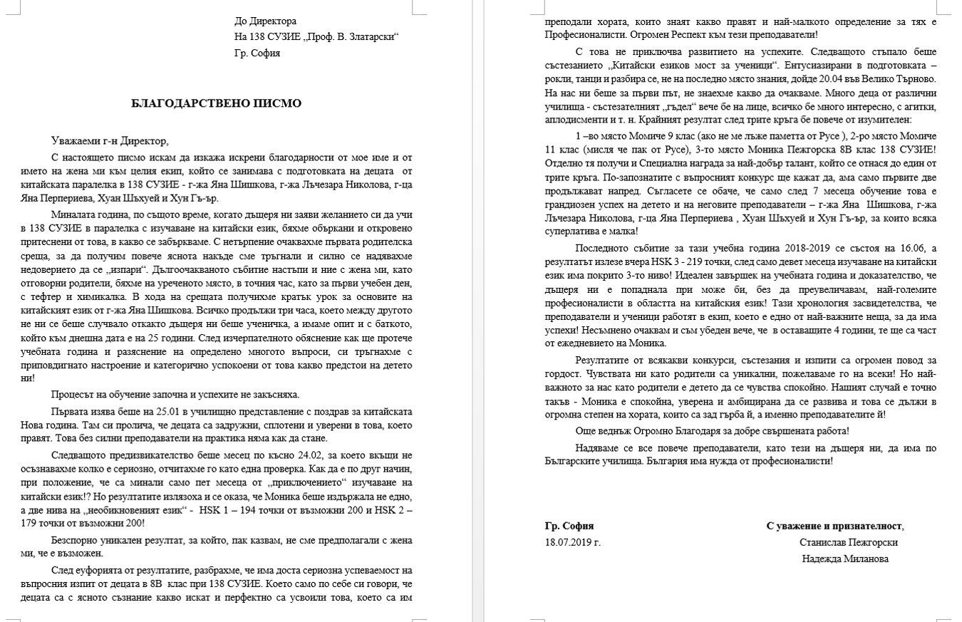 Здравейте, родители, учители и читатели! Ученичка съм в 138мо СОУ от 2016 година и искам да ви разкажа малко повече за самото училище! След 7ми клас сама реших, че ще се насоча към това училище с китайски език, защото като всички знаем той навлиза с бясна скорост към бъдещето! Така в училището има две лафки, също така има и столова (в която може да се хранят малките деца), всяка една учебна стая се разполага с интерактивна дъска, има две класни стаи по японски език изцяло ремонтирани, и стигнахме до най-хубавата част а именно - китайската стая "Конфуций"(Различна от скучните училищни стаи, внасяща хармония, спокойствие и вдъхновение).Тя е изцяло ремонтирана, направена е в китайски стил и създава невероятна атмосфера само при отварянето на вратата! Искам да разкажа за невероятните учители, които дават всичко от себе си за нас- учениците! Всяка година идват китайци, които да ни преподават (някои от часовете), както и нашите учителки Яна Шишкова и Лъчезара Николова, които непрекъснато се грижат за нас! Също така всяка година от училището се взимат ученици с добър успех и добро поведение, които могат да се насладят на прекрасния Китай. Аз миналата година имах тази възможност и когато се прибрах в България, бях омагьосана от културата и от отношението на китайслите към нас! Дойдох с още по-голяма мотивация за учене! Атмосферата в това училище е доста приятна, хората също, а учителите са блестящи! В училището се изучават много чуждестранни езици, но един от любимите ми е Китайският. Начина по който те докосват самите учители до този труден за нас език е великолепен! Тази година бях участничка в така нареченото състезание "Китайски езиков мост" завърших на трето място, като искам да отбележа, че това ми беше първото излизане и бях малко притеснена, но както знаете за всичко си има първи път! Самите учители ни дават много, борят се за нас, гонят ни докрай, естествено за да има резултат! Бих искала да посъветвам всеки един родител, който в момента се колебае в кое училище да запише детето си, с две горно вдигнати ръце и два крака ви казвам 138! Просто от това време в което съм в това училище наистина разбрах, какво е ДОБЪР УЧИТЕЛ! Ще се радвам ако и вие стане част от тази невероятна атмосфера! Blush
