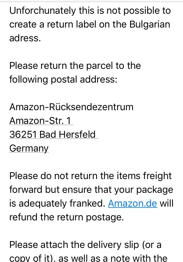 По 50 мейла си разменихме вече... Първо ми искаха домашен адрес/Като им обясних, че ползвам превозвач, не съм от Германия и т.н..../ Създадоха ми етикет с БГ адреса ми, но включиха цялата поръчка После уточних, че връщам само част. Създадоха друг, но с немския адрес на превозвача. Питах ги така ли трябва да бъде, да така можело...На мен ми е все тая кой ще го връща, така или иначе ми поемат пощенските, но като си помисля, че вече сме се изяснили и пак възниква питанка. Като приключа та я история ще опиша подробно как се връща пратка...