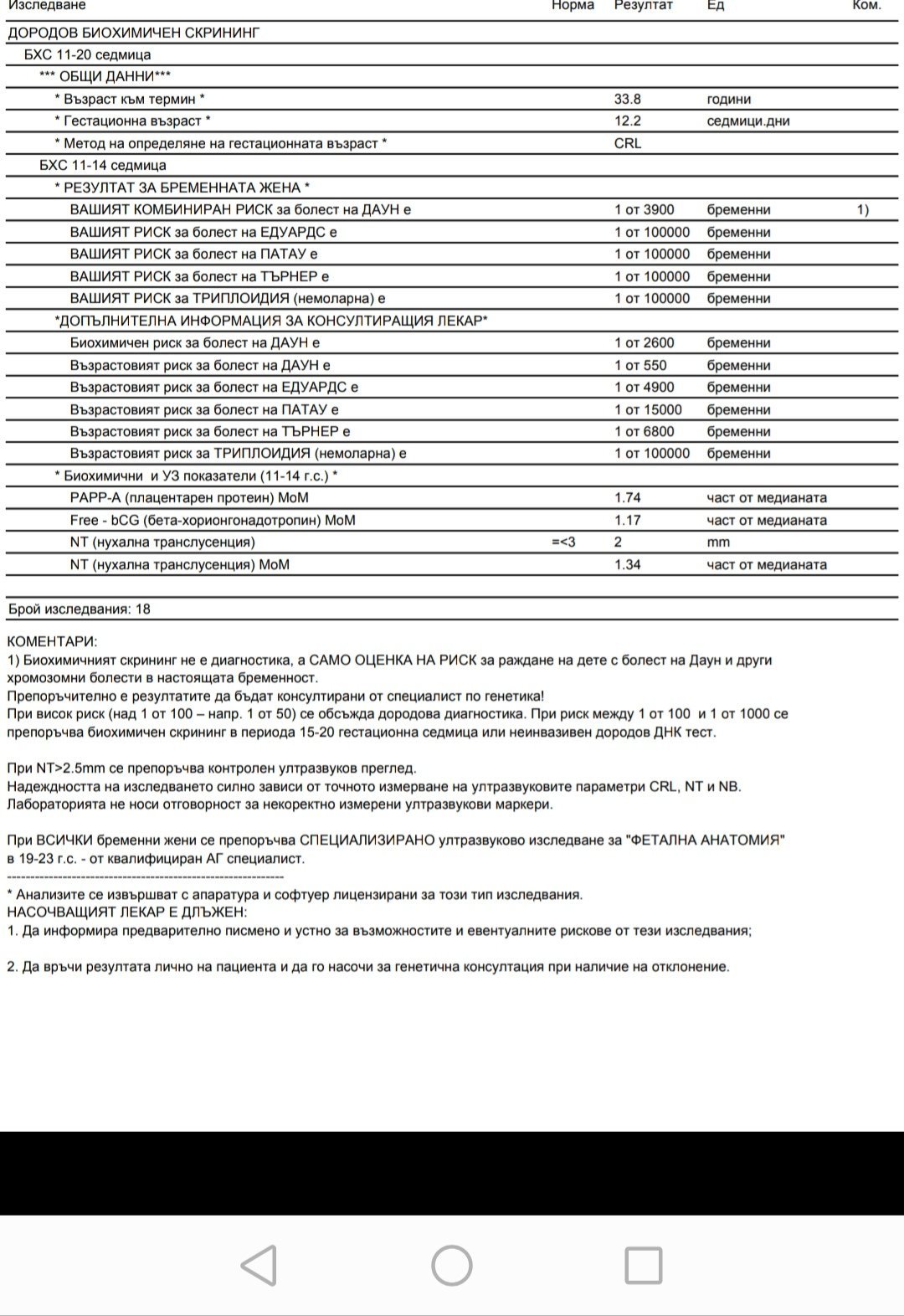 Какво мислите за този БХС? С първото дете риска беше доста по малък, а беше само преди 2 години!  NT е 2, казаха, че е наред всичко, но мен си ме гризе. Моля по - запознатите да ми обяснят, че в лабораторията не бяха много отзивчиви, а съм на лекар чак в събота.