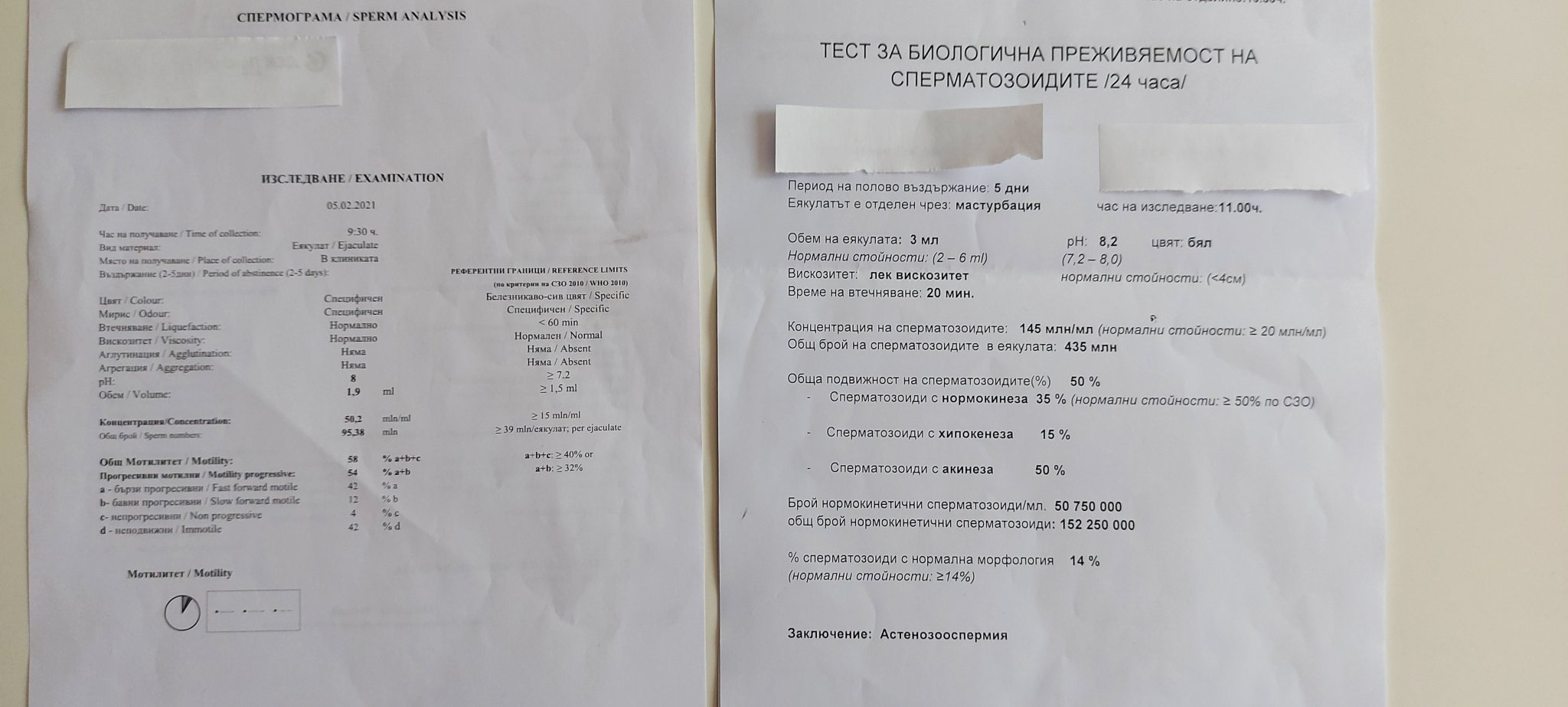 Първо се извинявам, защото не знам,дали мога да получа тук някаква помощ, но реших да питам МЦ new Life за мнение. Бих искала да попитам направихме втора спермограма при различни специалисти, мнението на единия беше, че е ок, а на другия, че не е ок спермограмата, като и двамата изписват скъпи лекарства на мъжа ми. Едните ги изпи, но бяха толкова захарни, като степче, че никак не му се отразиха добре. Другите са адски скъпи, та бих искала да изкажете мнение, зле ли е толкова положението, може ли с такива резултати да се подберат сперматозоиди при оплождане, инвитро? Качила съм ги една по една и ,след това наложени една до друга.