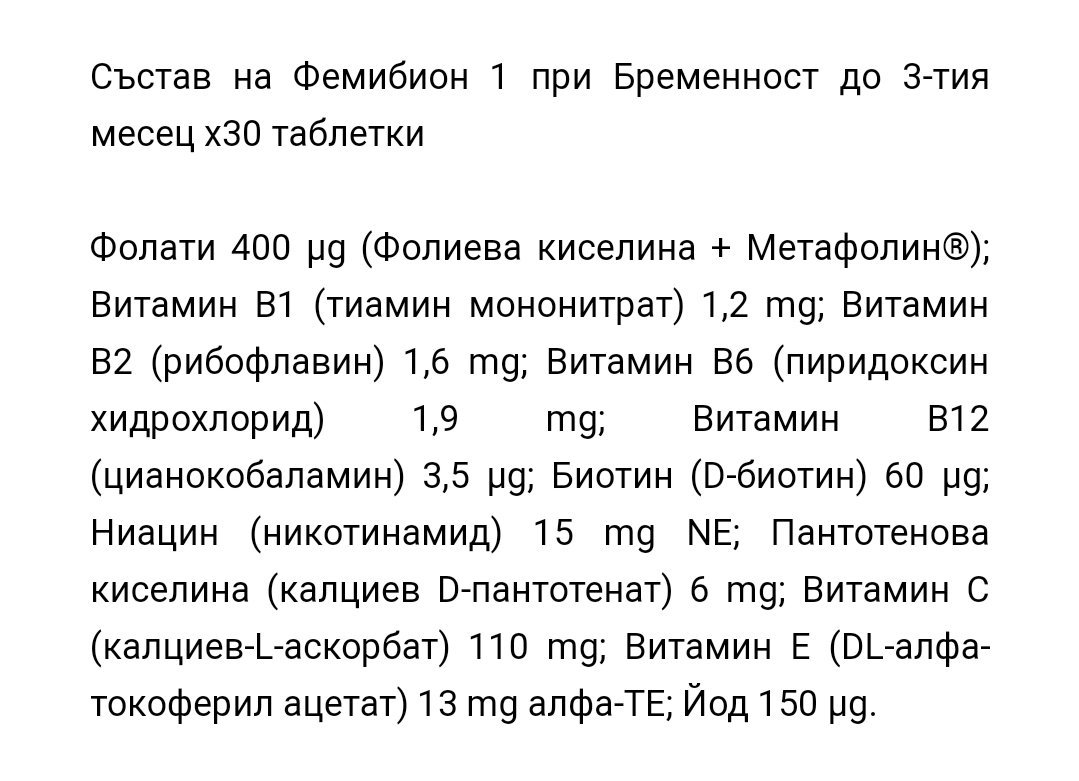 Лекар ми назначи л-карнитин по 2000мг на ден и Фемибион (прилагам състава на). Потърсих допълнителна информация и най-вече от твоите съвети тук и взех да пия и още неща- омега 369, магнезий,инозитол, вит Е, вит С, Q 10, мелатонин, спирулина