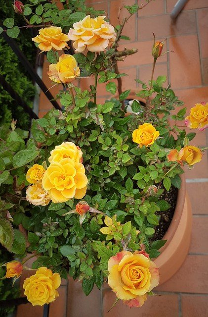 А и гледането на рози в саксии е много по-тегаво - непрекъснато са нападнати от някаква болест и трябва да се пръскат постоянно. Имам и две мини-щамби в контейнери, освен тази, но есента се наложи да преместя по-високата в градината, защото корените и станаха огромни.