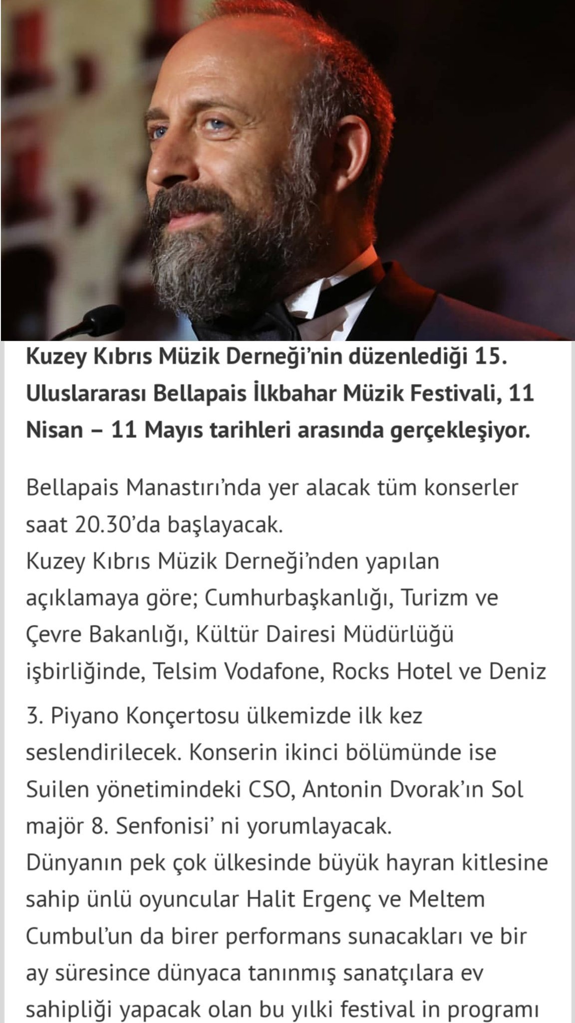 По сообщению официального агентства Кипра в Турции, 8 мая Халит Эргенч примет участие в 15-м Международном весеннем фестивале музыки, организованном Музыкальной ассоциацией Северного Кипра.