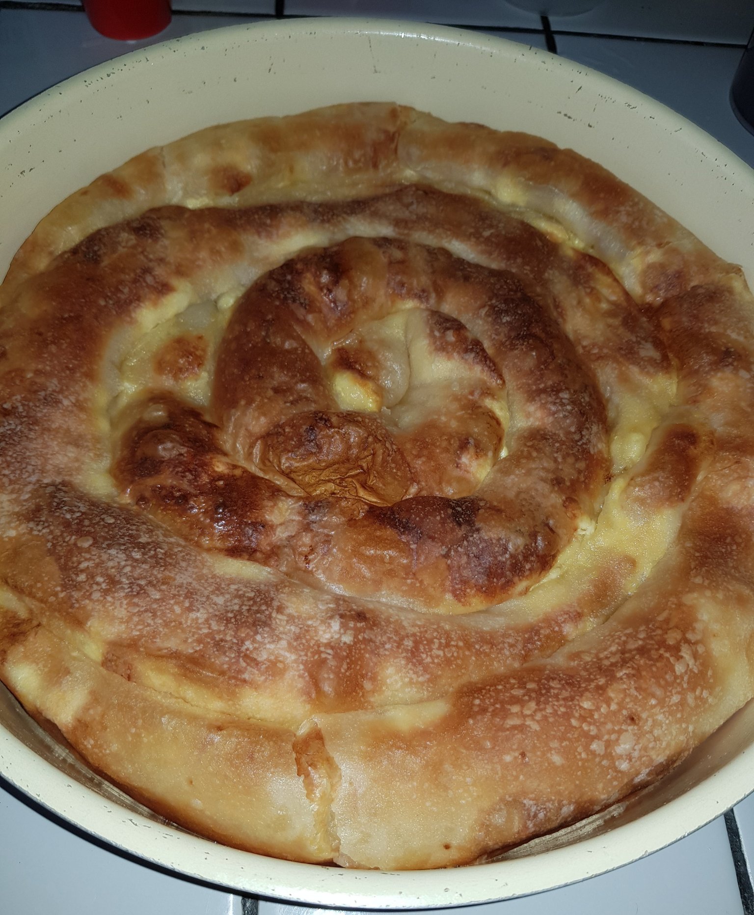 Омесих си баницата и вече се пече, ама не я направих с масло този път, че ще я носим на гости и ако е с масълце, трябва да се подгрее, но пак изглежда супер.