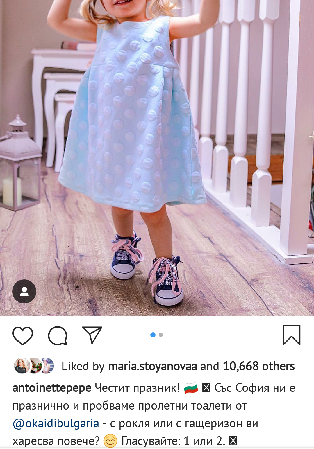 Вчера видях само на Пепе честитката за празника, понеже бях на работа и не съм имала време да гледам нищо. Забавно ми е как националният празник буди желание да сменяш тоалети на детето ти. Така се възпитават ценности предполагам. Адски гнусно ми е използването на децата за реклама на продукти, вече дори не просто покрай нея, за да показват каква мами ляйфстайлка за пример е. Ама тя си го и каза по бтв, че ще си ги ползва за доходи докато не разбират, а после може и да спре. С по-хубави думички разбира се.