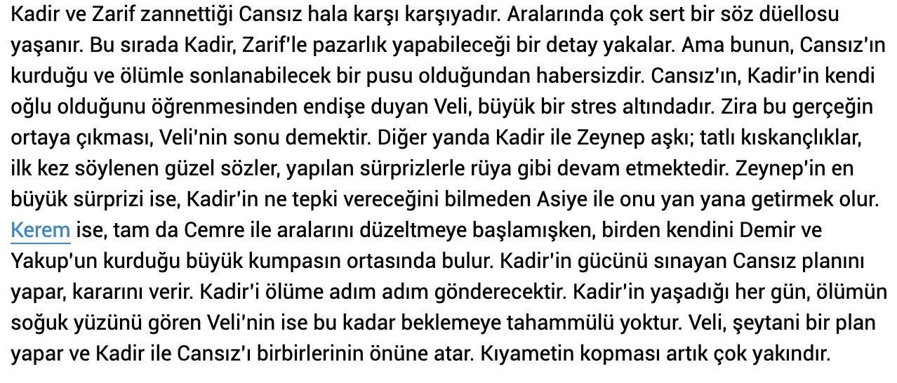 станет концом Вели. С другой стороны- любовь Кадира и Зейнеп; сладкие ревности, первые красивые слова, сюрпризы продолжаются, как сон... Большой сюрприз Зейнеп- это встреча Кадира с Асие, но не известно, какова будет реакция Кадира ...Между Керемом и Джемре отношения начинают налаживаться, но он вдруг понимает, что находится в центре ловушки, подстроенной Демиром и Якубом. Джансыз, проверяя силы Кадира, готовит свои планы и даёт указание. Кадир каждый прожитый день находится перед лицом смерти, но Вели не может так долго терпеть. Вели продумывает дьявольский план и сталкивает Кадира и Джансыза. Конец света приближается...