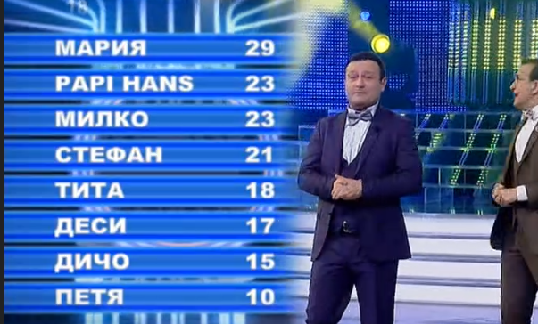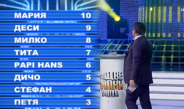 Дичо - 3, Петя - 4, Деси - 5, Стефан - 6, Константин - 7, Милко - 8, Мария -  9, Тита - 10