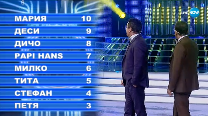 Мария си беше за първо място, Деси сигурно има място в тройката, но не съм я чула, Дичо твърдо не ми е за топ 3. Участниците с това разменяне на точки са ми малко скучни. Добре, че Мария не си върна точките на Папи, да има малко разнообразие.