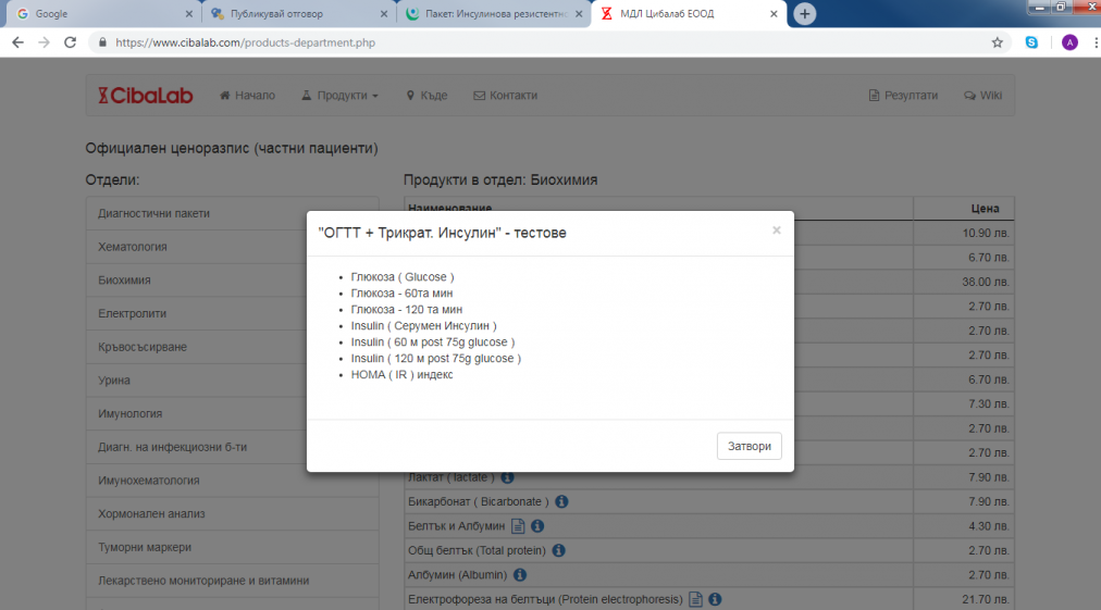 А на първия ред на "Биохимия" е "Гликиран Хемоглобин ( HbA1c )     10.90 лв."