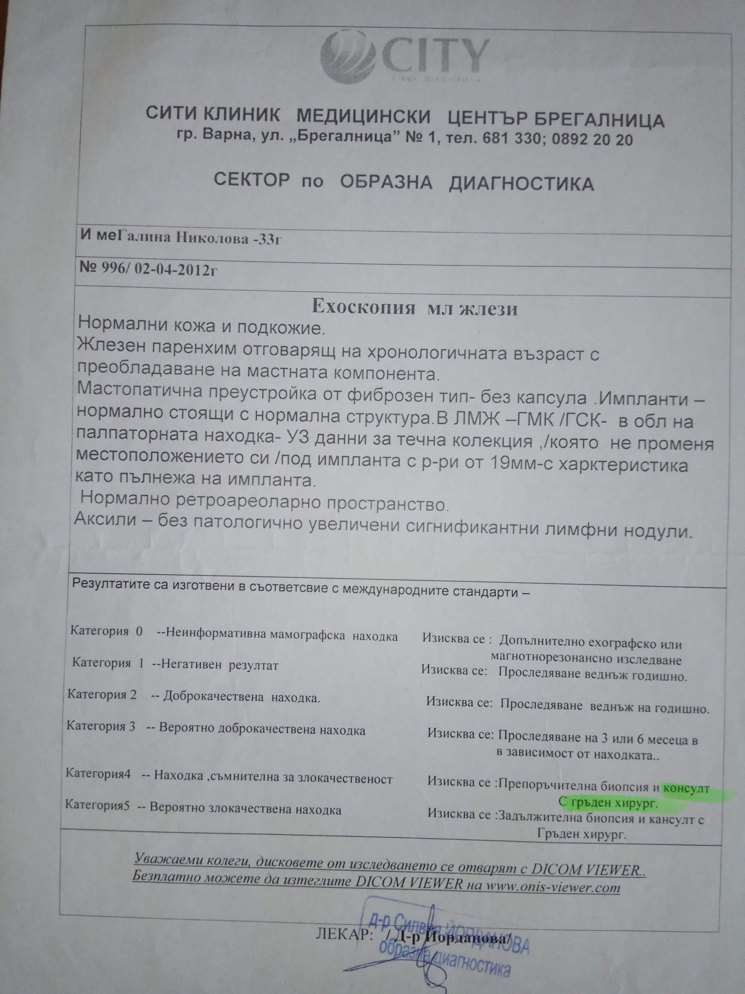 a.l.e.n.a, имплантите бяха Алерган Натрел 375 кръгли, и тогава на ехограф ми казаха, че не виждат руптура, др. Заякова също ми казваше, че всичко е наред, аз съмнения че може би е имало руптура започнах да имам, когато не получих имплантите веднага след експлантирането и ми обясниха нещо, че били биологичен материал и трябвало дълго време да се дезинфекцират, защото са стояли в мен 3 години,въпреки всичко приех това обяснение, може и така да е било...Но аз щях да ги сложа в шкафа, а не обратно в тялото си, че де се  дезинфекцират... Спрях да вярвам на др. Заякова, но дали имам основания не знам до ден днешен, не съм сигурна какво е станало, официалната информация е че всичко при мен е било наред....около 3 седмици след операцията, за да преодолея срива, оставих децата на едната баба и заминах за 1 месец извън страната, лека полека се оправих и после не съм ходила на консултация там, никога повече не съм я виждала дори...Но за руптура, никога не сме говорили,а съм посетила поне трима различни ехографисти, но съмнения имах и затова ги и махнах не знаех какво да мисля, виждам черно на бяло написано, течност около импланта, сходна с тази в импланта, но категорична позиция нямаше и аз изкарах почти 12 месеца чудейки се, имам ли основания за притеснение. Тук във Варна ме прегледа на ехограф онко-гръден хирург с добра репутация и даже ме успокои, че всичко е наред, но в мен съмнението остана и реших да не поемам риск и така...Изтеглих късата сламка в моя случай и четейки тук виждам, че сякаш е малък процента на жените с проблеми и се надявам да е така. Но всеки случай за проблем, който виждам тук ми действа все още много силно...