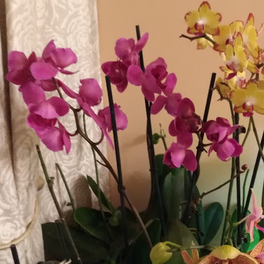 Отивам за седмичен пазар в Билла, естествено се зазяпвам в орхидеите (че то може ли, нали съм вече луда!), едни огромни цветове бели, едни петнисти жълти (ама нали вече с жълто, розови се снабдих...) и гледам една с прелестни цветове - разклонени цветоноси, цикламено-лилави, пелорик... любов от пръв поглед! Огледах корените, викам си - моя е! На следващия ден чак видях, че е с централен цветонос