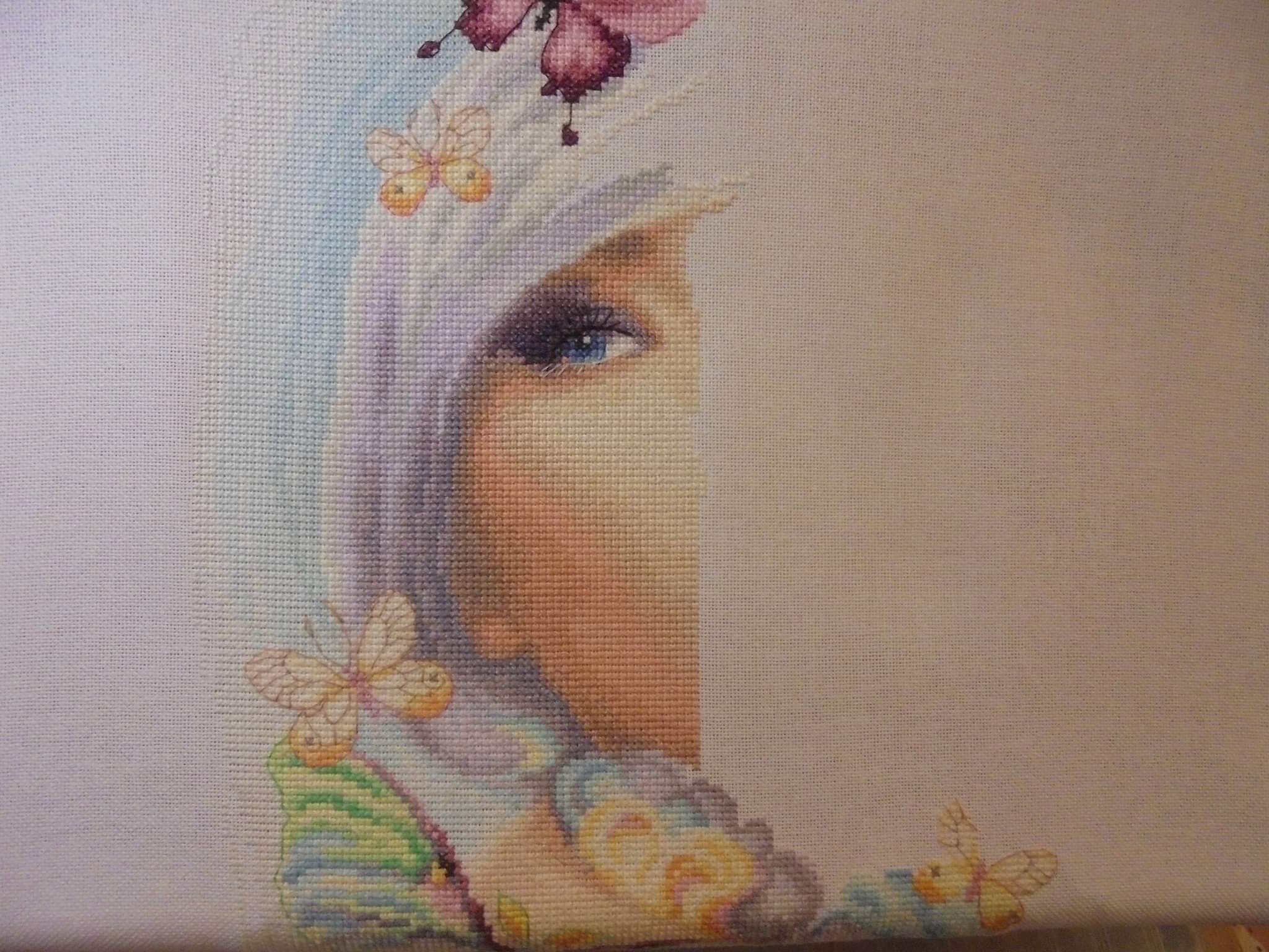 Здравейте дами,показвам и аз етап от моето занимание,много си го харесвам,но качеството на конците ми трови нервите.Конеца за контура на цветята не ми стигна и се наложи да продължа с подобен,защото не намерих същия.