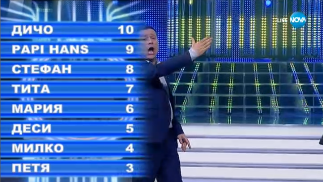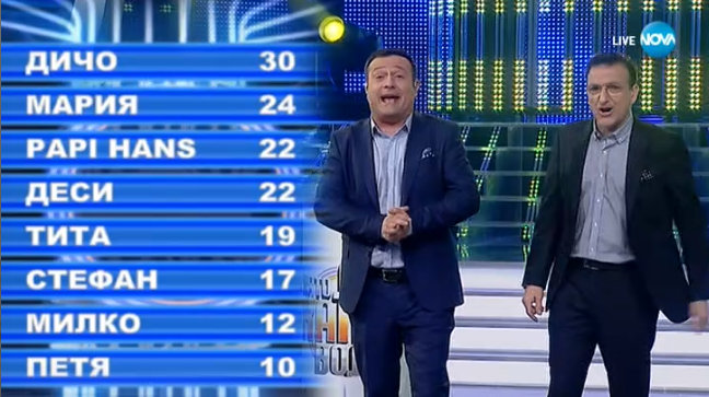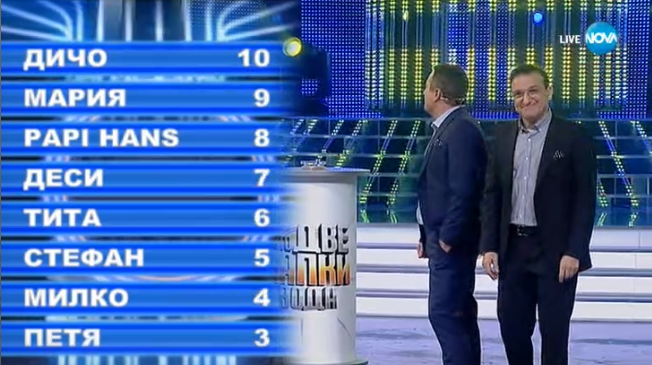 Милко - 3, Петя - 4, Стефан - 5, Мария - 6, Деси - 7, Тита - 8, Константин - 9, Дичо - 10
