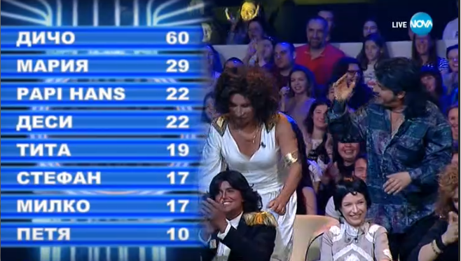 Петя - 3, Деси - 4, Мария - 5, Милко - 6, Константин - 7, Тита - 8, Стефан - 9, Дичо - 10
