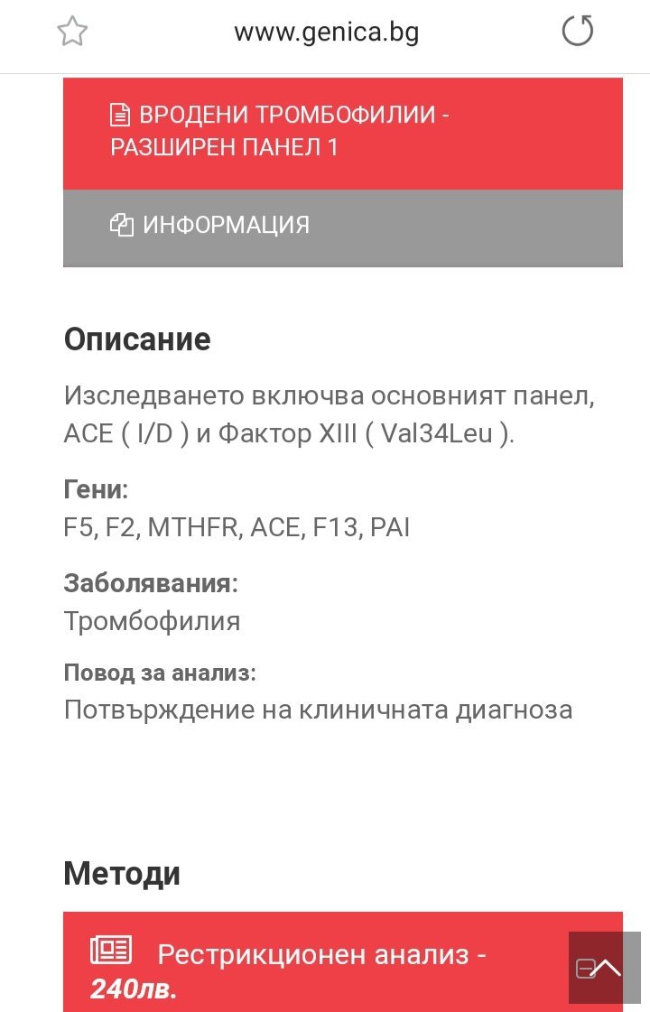 за генетичните изследвания за тромбофилии мога да се включа и аз - в Надежда също ги правят - твърдят , че имат собствена лаборатория. Пакетът е като разширения пакет в МД и основния в Геника (фактор V, протромбин, двете мутации на MFTHR и PAI).Цената е най-висока от трите лаборатории - 170лв, т.е. в МД е най-евтино, а времето за изработка е едно и също - десет раб. дни. Аз ги пуснах в Надежда , защото ми е най-удобно като работно време ( лабораторията работи и през уикенда).Само в Геника обаче изследват и останалите три панела, но ще се консултирам първо с лекар дали да ги пусна и тях.