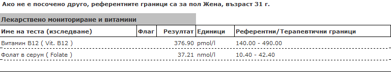 Аз малко съм в шах. След като излезе MTHFR мутация Херетозигот А1298C, днес пуснах да видя нивата на Б9 и Б12, за да мога да направя контрола след месец. Реално очаквах фолата да излезе в дефицит, особено след аборта заради малформация, но резултатите ме озадачиха: