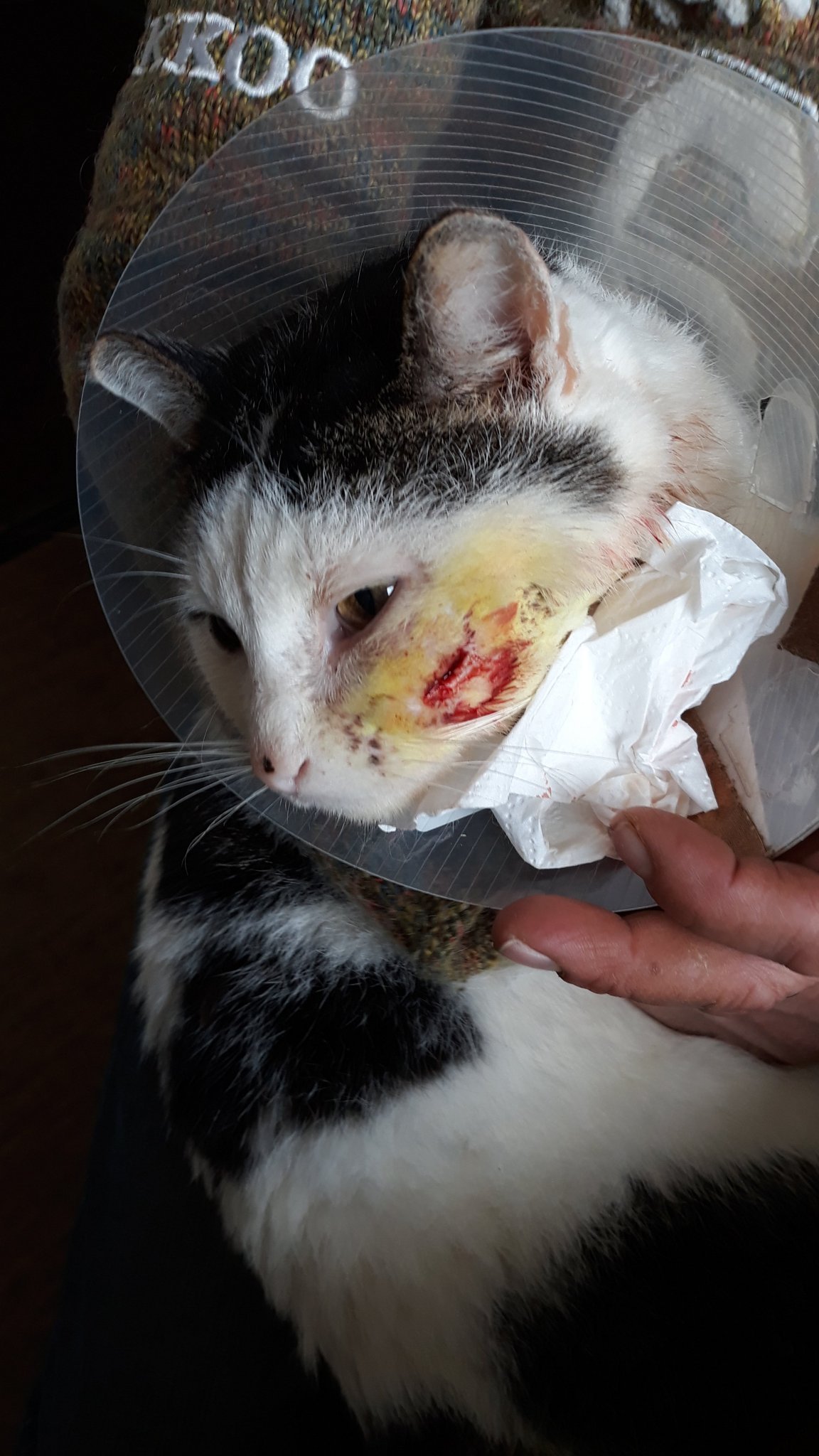 По-добре ми изглежда вече. Дано скоро разрешат да махнете фунията, но по-добре да е на него в момента, защото раната лесно може да се разтвори с едно почесване.