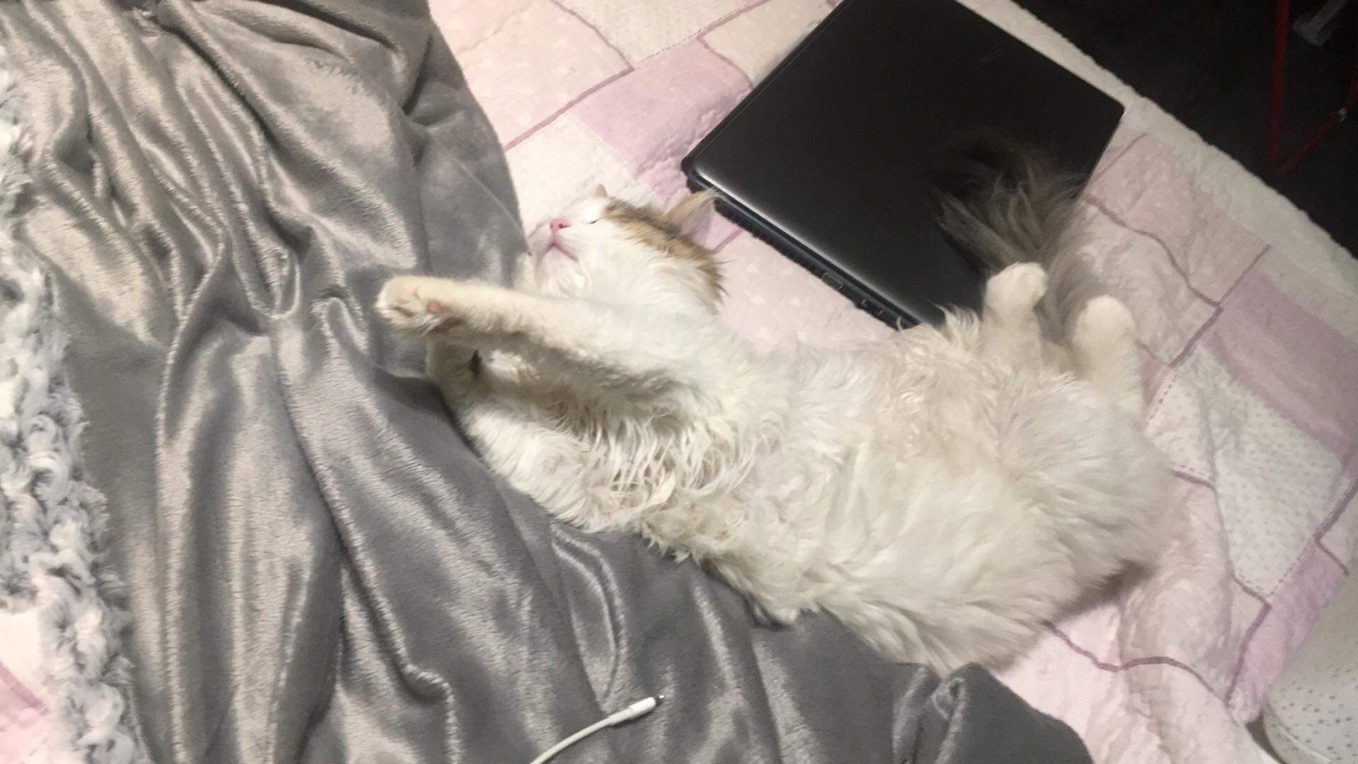 Нямам идея защо, но напоследък спи само в подобни пози с вирнати лапи и по гръб. Преди спеше като нормална котка. Не разбирам топло ли му е, нещо не е ок ли?