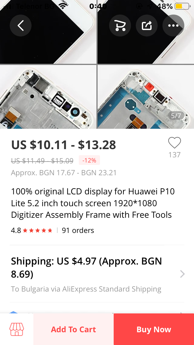 П.с. това на картинката е дисплей с тъч залепен на носещата рамка. Същият търговец предлага и само дисплей без рамка - внимавайте какво поръчвате. Ако рамката ви е здрава ще ви е в пъти по-лесно да отлепите повреденият вече дисплей отколкото батерията от рамката