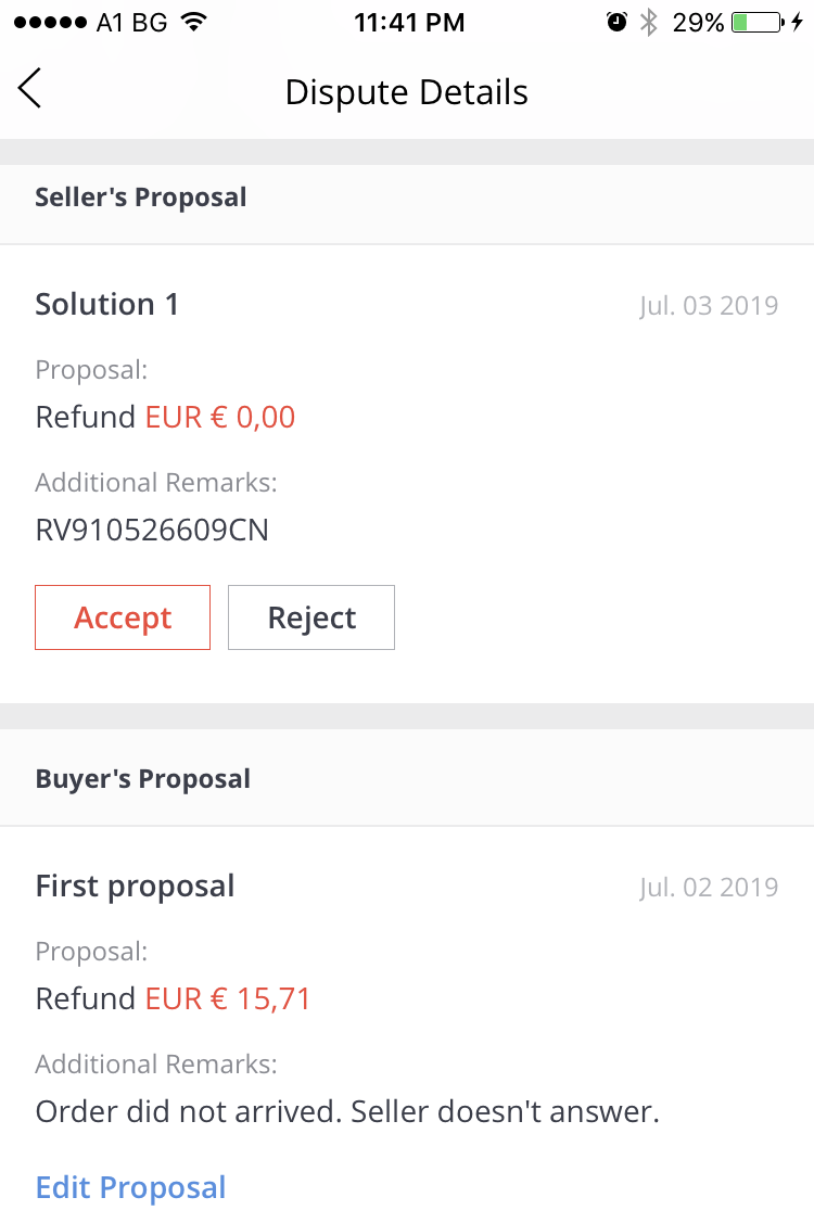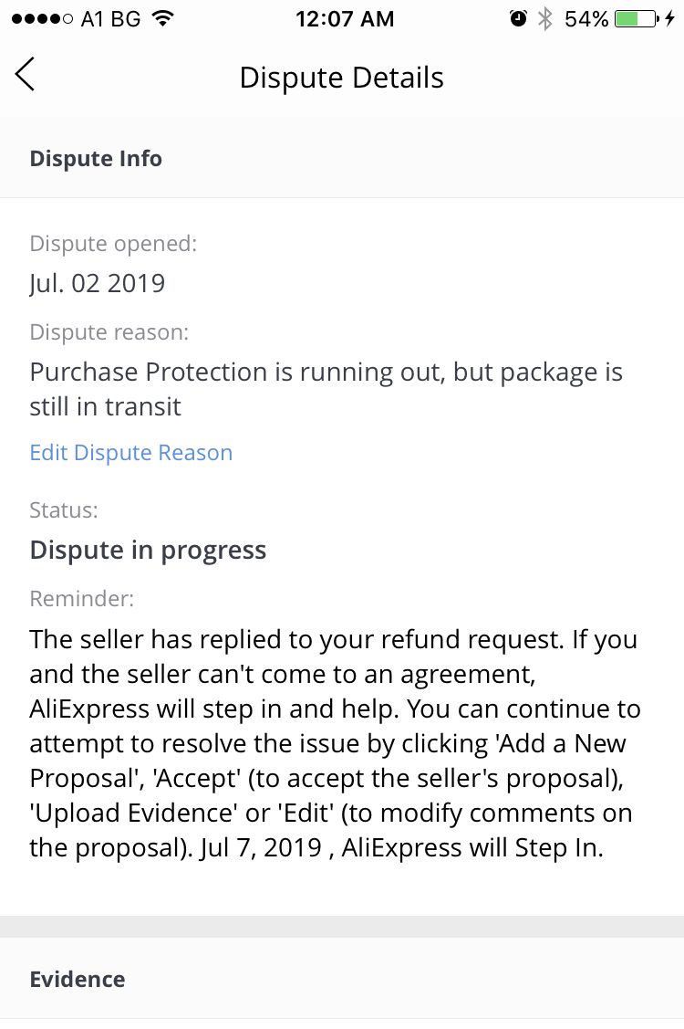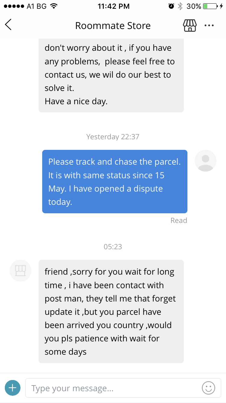 Сега трябва продавача да поиска от китайски пощи издирване на пакета. Всичките му писания са копи пейст за клиенти балъци. Отхвърляте предложението му в диспута и чакате Али да се намесват.