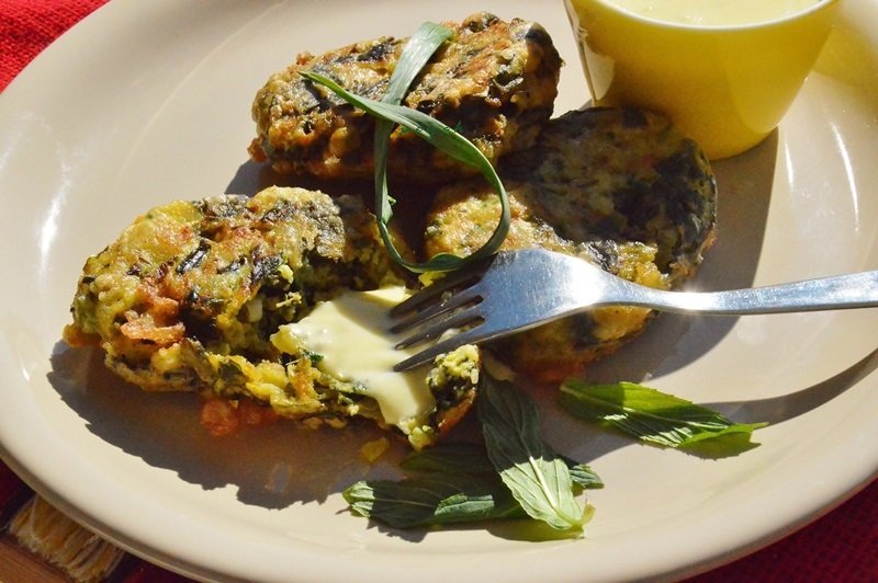 Омлет си правих наскоро, аз харесвам такива зелении и си го правя с лапад, спанак - което имам. Нарядан лапада с много мъничко мазнина го задуших в тигана докато се свие, метнах го при разбитите яйца, сложих и малко сиренце и си изпържих омлета нормално. Или пък сиренето вместо в сместа, после по средата на омлета, като го прегъна на две. За мен си е много вкусно и става за нула време. Понякога запържвам и малко лук или праз преди зеленото, абе каквото ми скимне в момента. То е подобно на това грузинското от предния пост, само че още по-бързо и в единична порция.