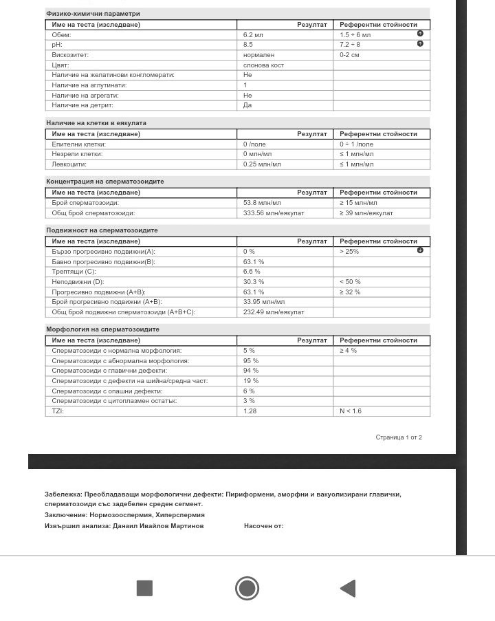 РАЗШИРЕНА СПЕРМОГРАМА No: 0038/10.01.2020 г.Физико-химични параметриИме на теста (изследване)РезултатРеферентни стойностиОбем:6.2 мл1.5 ÷ 6 млpH:8.57.2 ÷ 8Вискозитет:нормален0-2 смЦвят:слонова костНаличие на желатинови конгломерати:НеНаличие на аглутинати:1Наличие на агрегати:НеНаличие на детрит:ДаНаличие на клетки в еякулатаИме на теста (изследване)РезултатРеферентни стойностиЕпителни клетки:0 /поле0 ÷ 1 /полеНезрели клетки:0 млн/мл≤ 1 млн/млЛевкоцити:0.25 млн/мл≤ 1 млн/млКонцентрация на сперматозоидитеИме на теста (изследване)РезултатРеферентни стойностиБрой сперматозоиди:53.8 млн/мл≥ 15 млн/млОбщ брой сперматозоиди:333.56 млн/еякулат≥ 39 млн/еякулатПодвижност на сперматозоидитеИме на теста (изследване)РезултатРеферентни стойностиБързо прогресивно подвижни(А):0 %> 25%Бавно прогресивно подвижни(B):63.1 %Трептящи (C):6.6 %Неподвижни (D):30.3 %< 50 %Прогресивно подвижни (A+B):63.1 %≥ 32 %Брой прогресивно подвижни (A+B):33.95 млн/млОбщ брой подвижни сперматозоиди (A+B+C):232.49 млн/еякулатМорфология на сперматозоидитеИме на теста (изследване)РезултатРеферентни стойностиСперматозоиди с нормална морфология:5 %≥ 4 %Сперматозоиди с абнормална морфология:95 %Сперматозоиди с главични дефекти:94 %Сперматозоиди с дефекти на шийна/средна част:19 %Сперматозоиди с опашни дефекти:6 %Сперматозоиди с цитоплазмен остатък:3 %TZI:1.28N < 1.6Пациент: 29Партньор:Полово въздържание: 4 дниСтраница 1 от 2