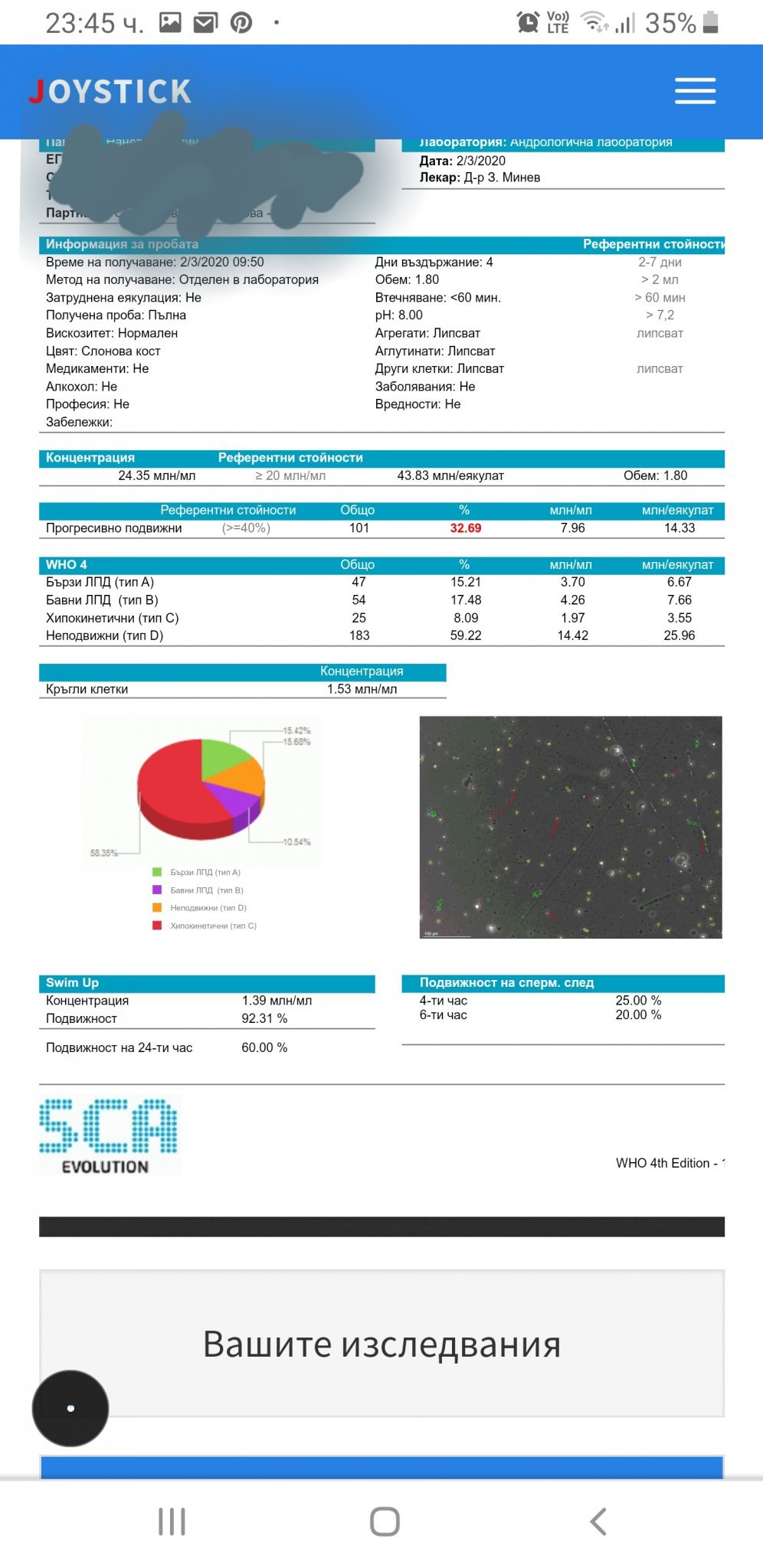Резултати от разширена в Адела (реших да не ходя в Щерев) и микробиология която май не е правилната или поне не много детайлна. Нищо не й разбирам. Започнах да пия бабини зъби преди това. От 1 седмица пия и С-мен саше от 2 дена (л аргинин, л Л-карнитин, витамин е) Мака и Цинк (50мг) Като цяло подвижността е паднала от последната (35.6%), но може така да се е случило просто, пък обема се е дигнал, предвид по-малкия период на въздържание, които няма 3 дена, така го писаха.