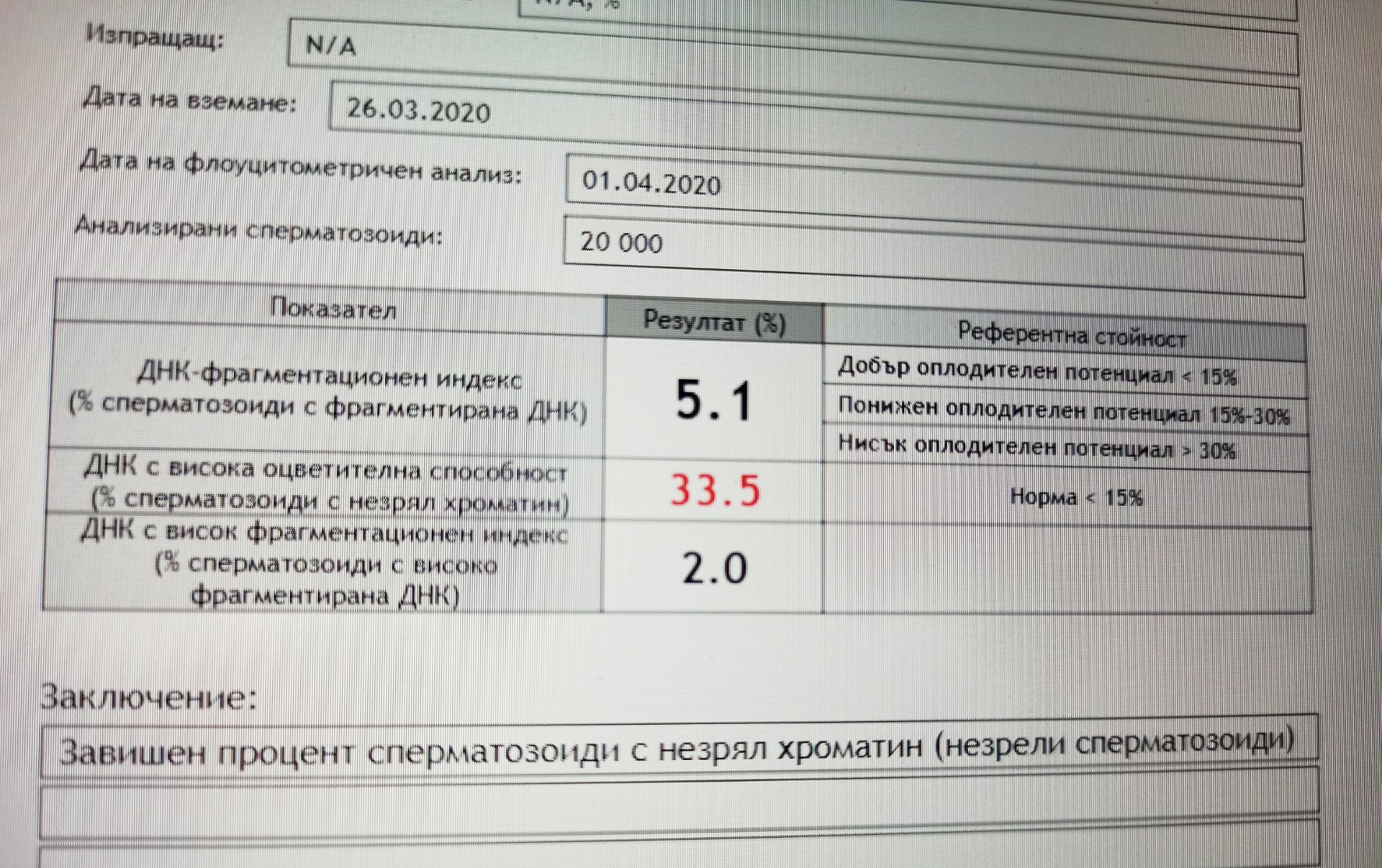 Здравейте момичета! Имам нужда от вашата помощ за разчитане на един резултат от SDI. Накратко опитваме от 2 години и няколко месеца, с мъжки фактор сме - много лоша морфология само 2 % читави, която е вследствие на варикоцеле. То беше премахнато, но така и нямаше подобрение в морфологията след операцията. Подобри се единствено концетрацията и подвижността. Насочени сме за инсеминация този месец, но бях на преглед при Русев и той ми каза,че е хубаво да направим и един SDI, от който днес излезна резултата.
