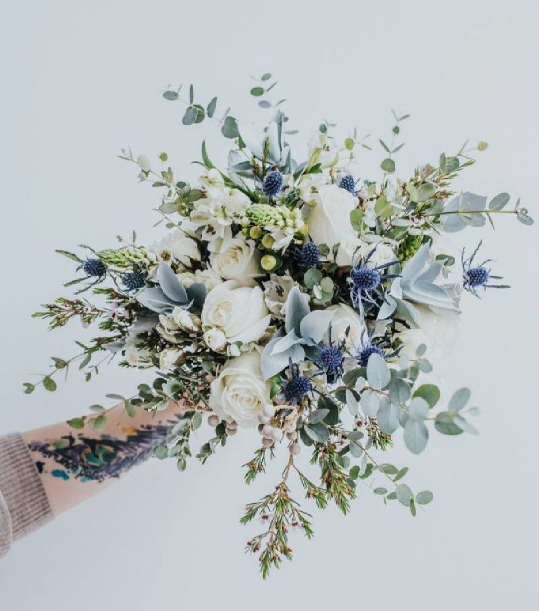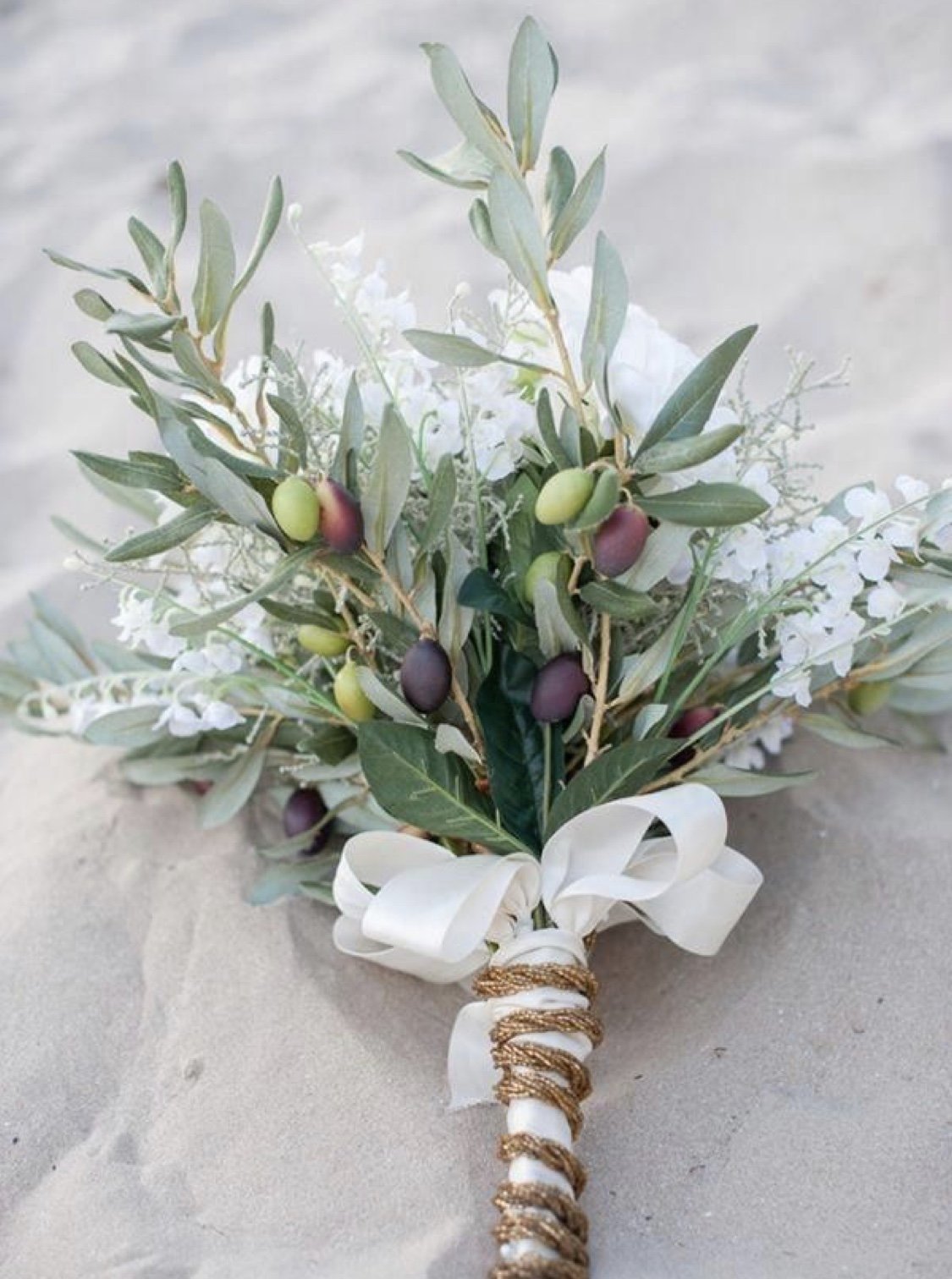 За букета и аз съм се спряла на такъв по-рошавичък Joy , използвах снимка от пинтерест, но цветята ще са малко по-различни от тези на снимката. Момината сълза я заменихме с някакво друго бяло цвете, което ще дава повече пълнеж (не си спомням името му) и някои от маслиновите клонки ще са боядисани в златно.