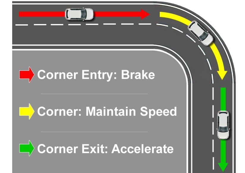 Да кажем, че най-просто казано е това на картинката. Само че някъде между тъмно червеното и жълтото е смяната на предавката. А и аз лично не подавам газ в самия завой, а вече на излизането от него, но това трябва сама да си го усещаш кога.